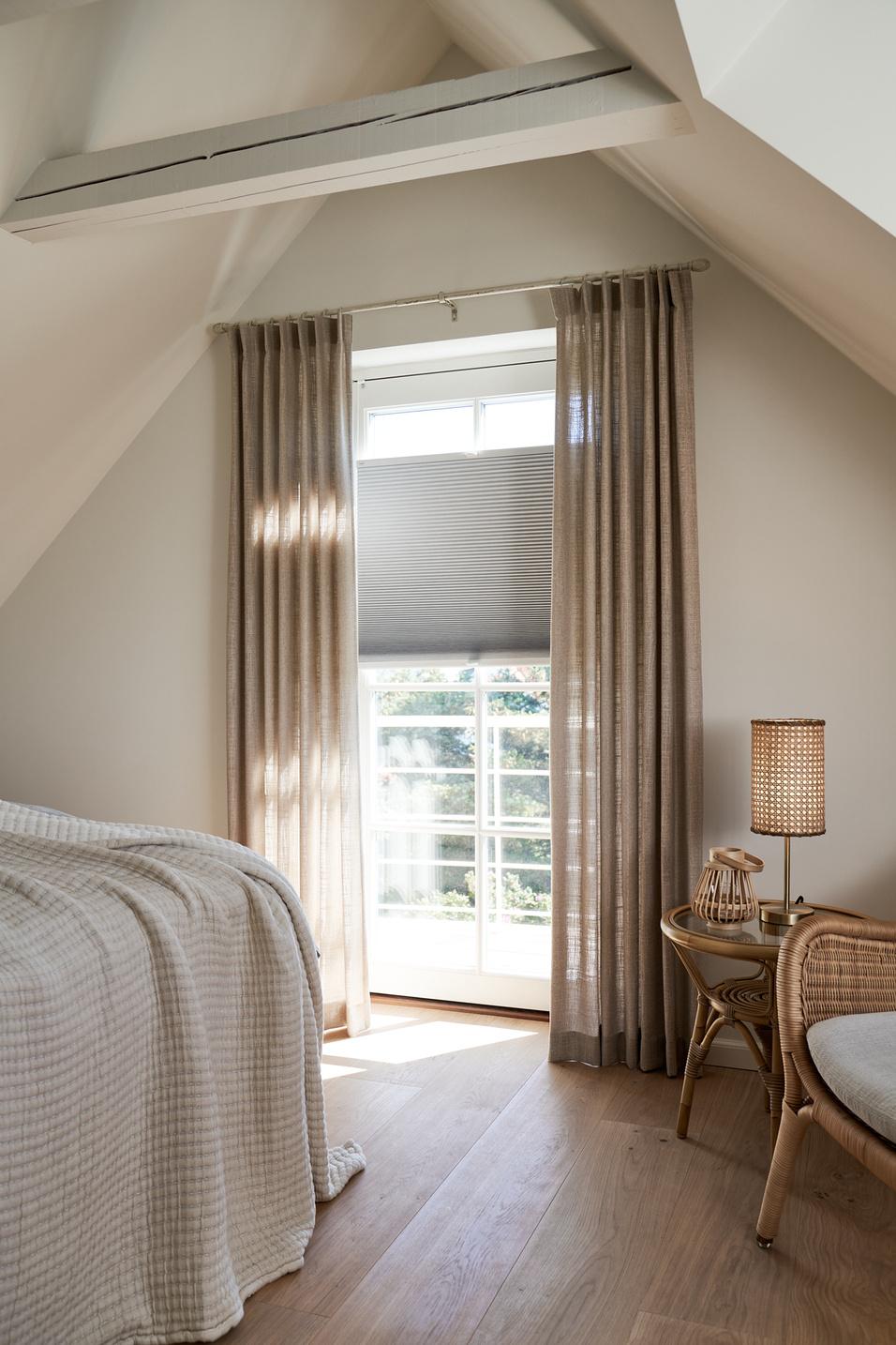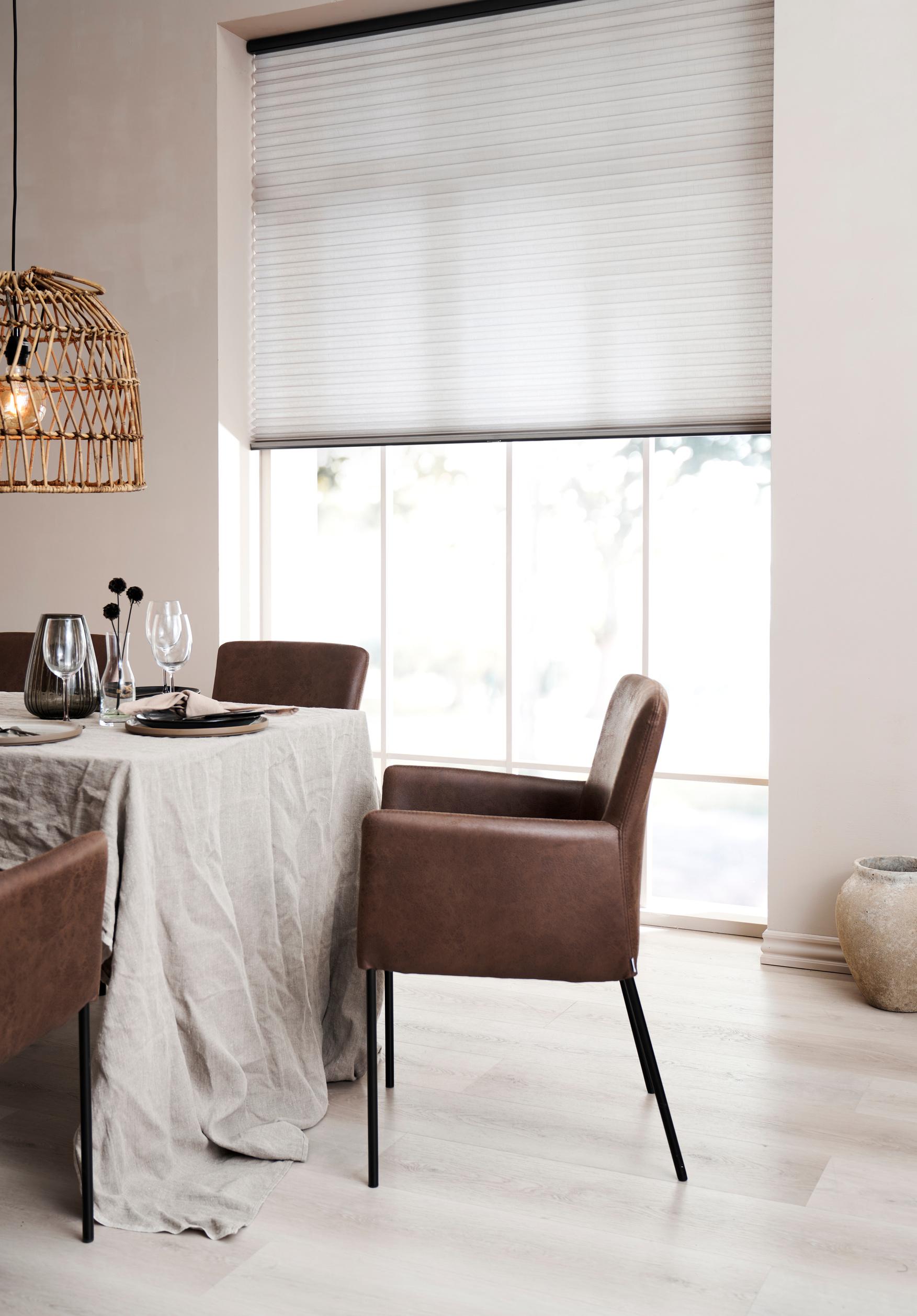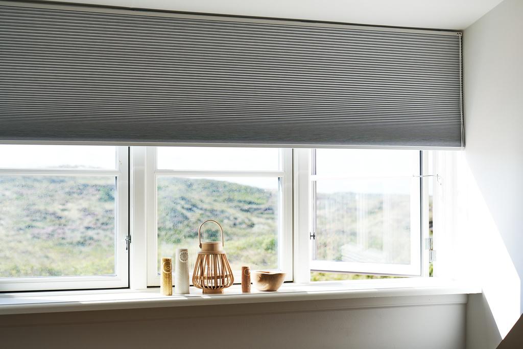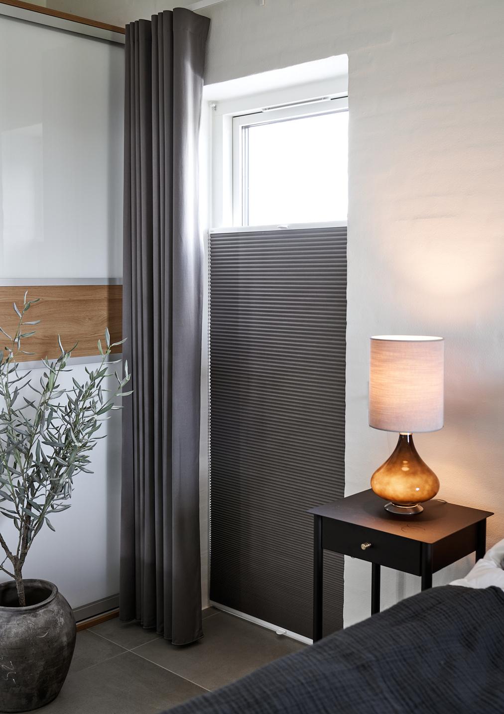 Vælg eksempelvis et stofgardin med struktur og kombinér det med et plisségardin for en naturlig og varm atmosfære