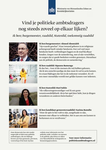 Vind je politieke ambtsdragers nog steeds zoveel op elkaar lijken? Ik ben; burgemeester, raadslid, Statenlid, toekomstig raadslid Ik ben burgemeester: Ahmed Aboutaleb “Op waarde geschat”. Waar iemand geboren is en religieuze achtergrond heeft minder betekenis. Wat wel veel meer betekenis heeft: verbindingen leggen en de stad bij elkaar houden. Zorgen voor de samenleving, met al zijn verschillen, en zorgen dat er goede besluiten worden genomen. Dienstbaar aan de politiek, de democratie en samenleving.” Ik ben raadslid: Mpanzu Bamenga Ik doe het… Voor al die mensen die mij hebben gekozen. Als ik iets onrechtvaardigs zie dan moet ik wel in actie komen. En eraan bijdragen dat het in de toekomst verandert. Ik wil een meer menselijke wereld met gelijke kansen voor iedereen.