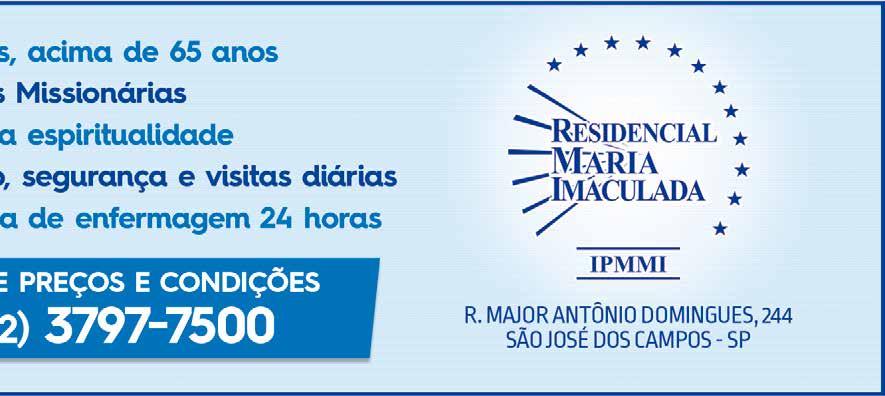Fundação Sagrada Família - Publicação Mensal da Diocese de São José dos Campos Bispo Diocesano: Dom José Valmor Cesar Teixeira, SDB • Supervisão Geral: Pe. Edinei Evaldo Batista - Jornalista Responsável: Bruno Andrade – MTB 89.844 • Colaboram nesta edição: Vatican News, Diácono Pasquale Gerardo (Chanceler da Cúria Diocesana), Dicastério para a Causa dos Santos – Santa Sé, Seminarista Bruno Bustamante, Seminarista Elder Bachião, Seminarista Franciélio Dias, Seminarista Jefferson Oliveira, Seminarista Sérgio Júnior, Ana Paula (Oficinas de Oração e Vida), Pe. Sebastião Cesar Barbosa (Assessor Diocesano para a Comissão do Ecumenismo e Diálogo Inter-Religioso), Neusa (Comunidade Com Deus), PASCOM São Sebastião, PASCOM Santa Inês, PASCOM São João Bosco e PASCOM N. Sra. de Lourdes, Pe. Luis Fernando Siqueira (Pároco da Catedral São Dimas), Pe. Djalma Lopes (Vigário Geral e Reitor do Seminário Propedêutico São José), José Carlos (Coordenador Diocesano da CF) •Diagramação: AB&G Comunicação e Marketing. Redação e Publicidade: Pça. Monsenhor Ascânio Brandão, 01 - Jd. São Dimas - São José dos Campos - CEP 12245-440 • Tel.: (12) 3928-3929 – e-mail: comunicacao@diocesesjc.org.br.