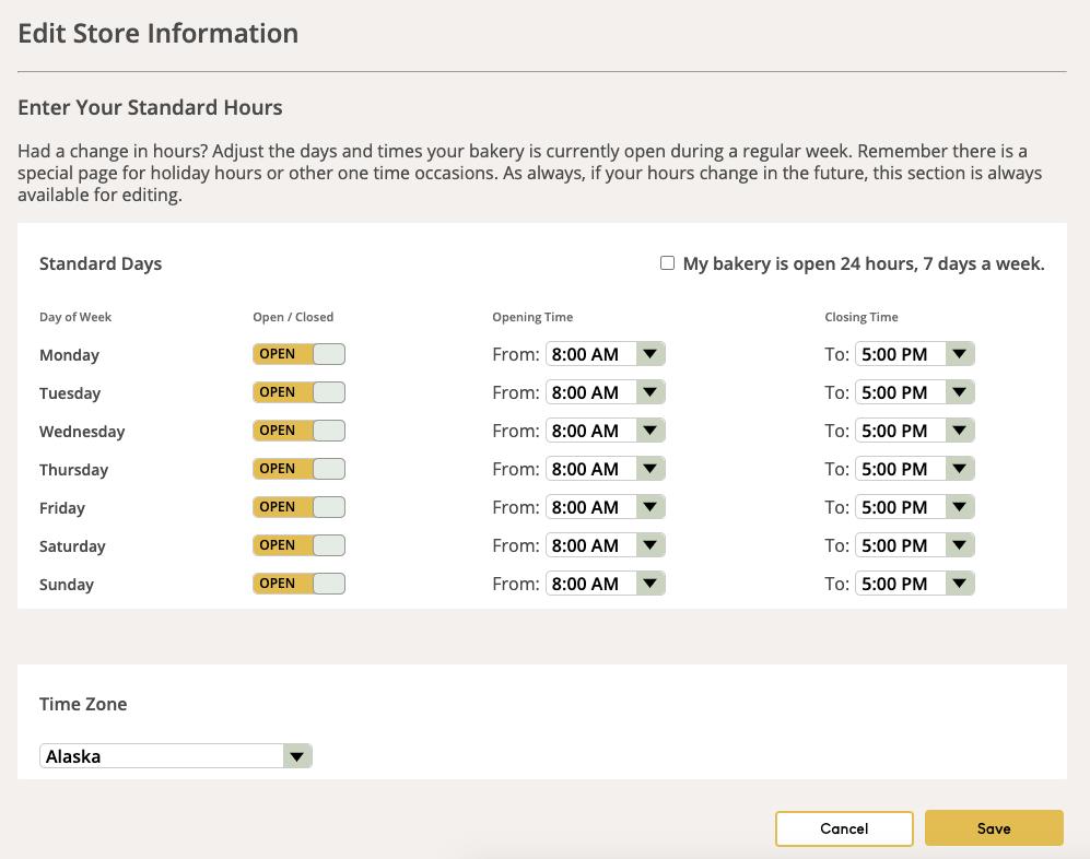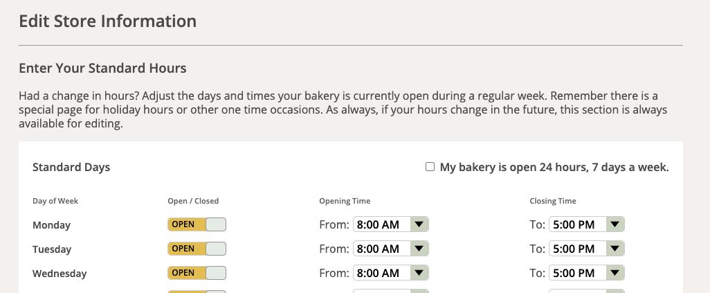 To set your store’s hours navigate to Store > In Store > Standard Hours > Edit. Hours can be adjusted manually for each day of the week, or you can mark your bakery as open 24/7
