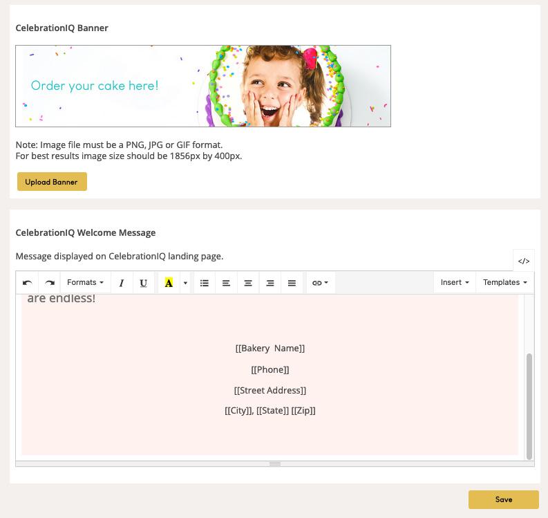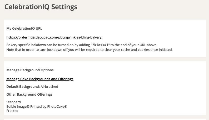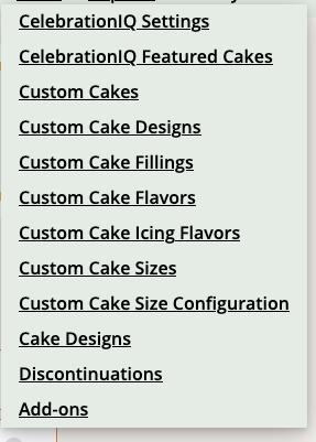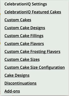 Under Bakery Cakes > CelebrationIQ Setting you manage your CelebrationIQ storefront banner and welcome message, the types of cake designs your bakery offers, enable CelebrationIQ online ordering, and more.