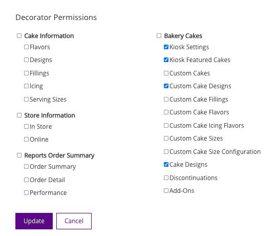 C. Select Update Role Permissions . Select the check boxes for each access you would like for the decorator role.