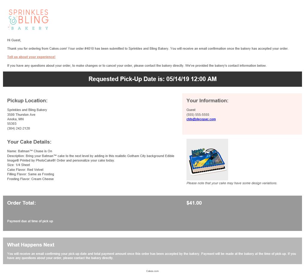 Customer pays for and receives cake in the manner they chose when placing the order.