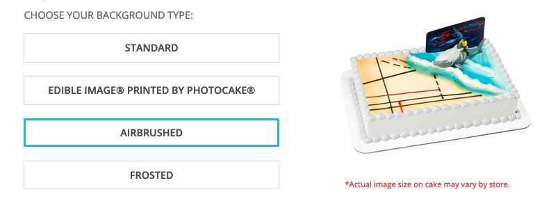 2. Choose available background offerings: Standard designs match DecoPac's supplied cake decorating instruction cards. Edible Image uses a PhotoCake Enhanced Background.