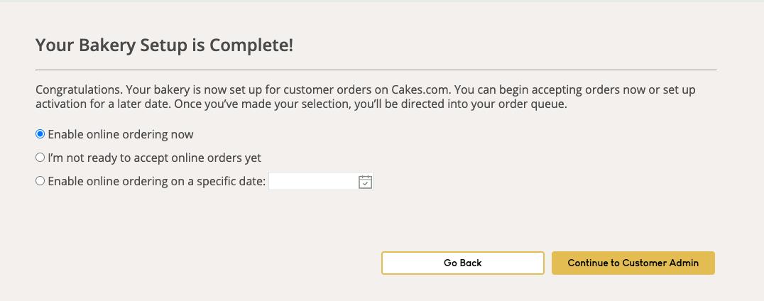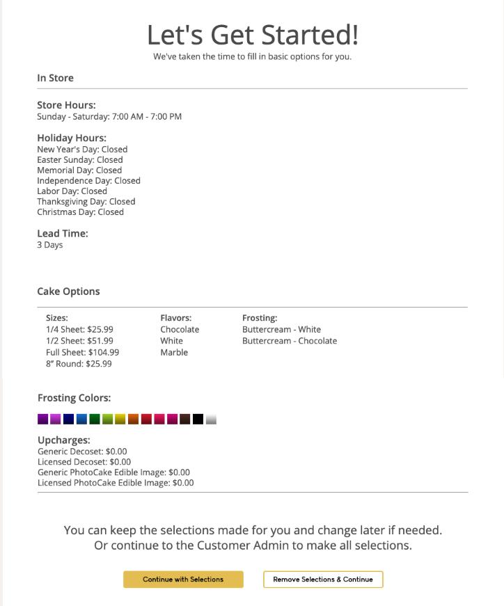 7. In order to make the process quicker, we auto-populate basic options for your bakery setup. All settings and options can be changed in the Customer Admin at any time.