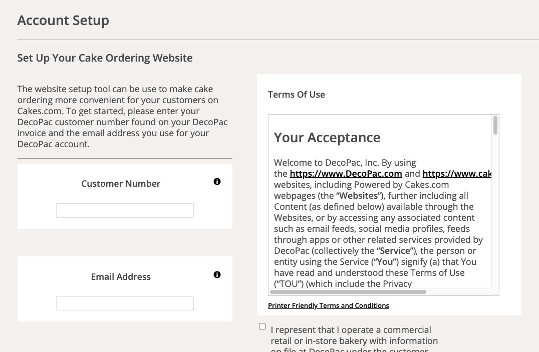 2. Once your DecoPac.com account has been established, visit https://order.cakes.com/ account-admin/setup to begin your CIQ setup.