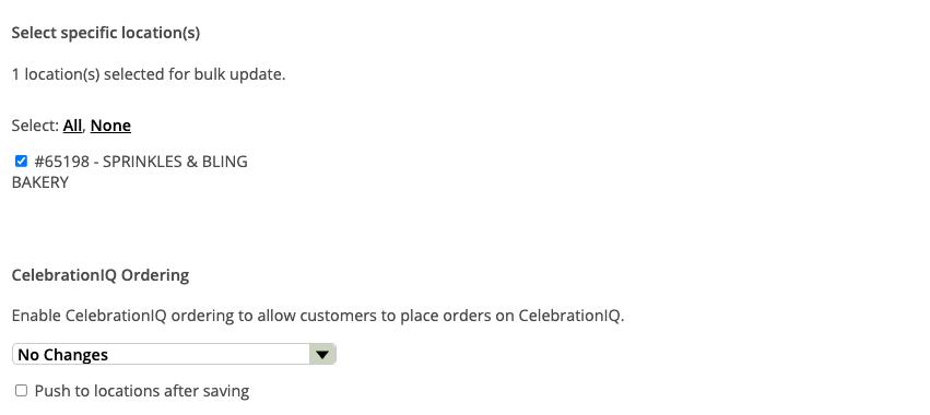 For bakeries and retail stores with more than one location, the CelebrationIQ admin allows multiple updates and changes to be made by one user. Location Login allows you to log into stores individually to make edits and accept orders. Mass Updates gives the ability to make a single update and these changes are made all at once for all bakery locations selected