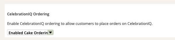 D. This is where you enable or disable Cake Ordering Online. Enabling allows customers using your CelebrationIQ site the option to place an order online. Disabling still allows customers the ability to search and view your cake offerings, but instead directs customers to call to order.