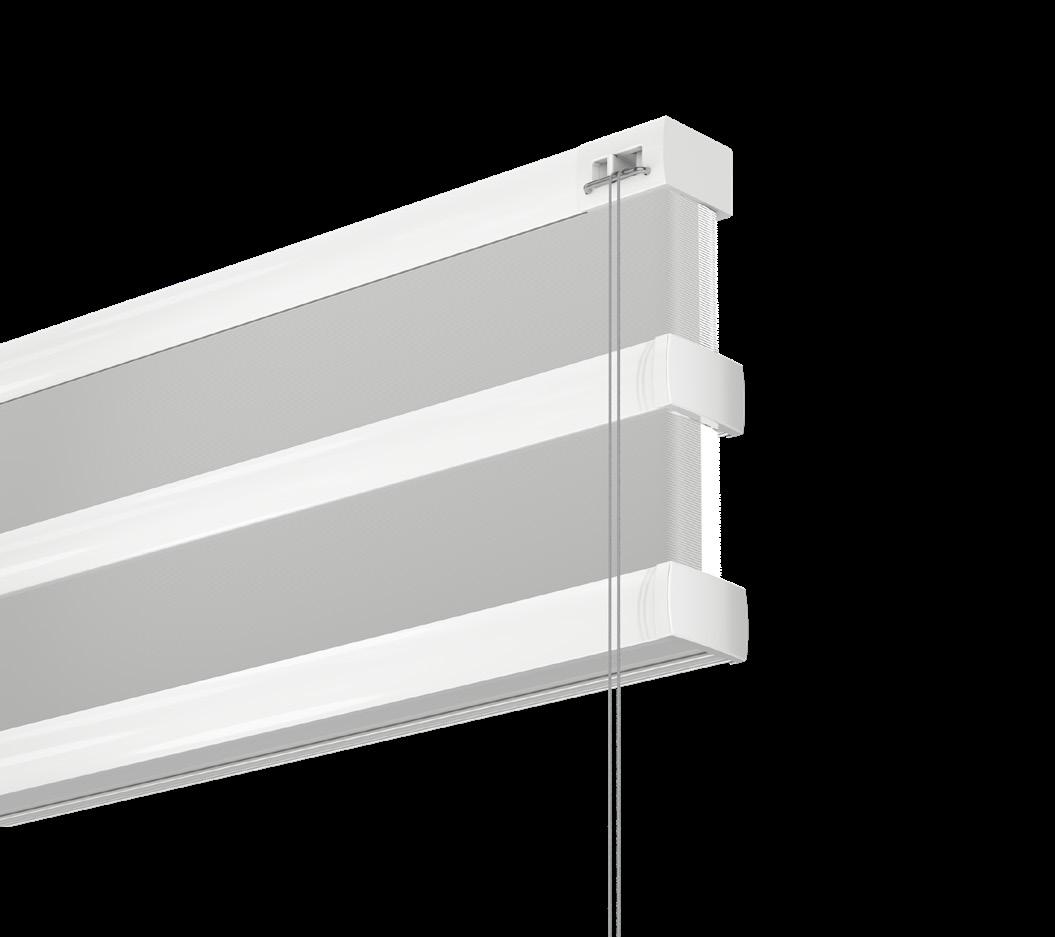 Top-down bottom-up operation V02 the easy-to-use cord lock presents premium light control and privacy. The fabric is held within an additional slimline profile that allows the fabric to sit at any point, enabling view to the top and bottom section, whilst the fabric offers privacy to head height in the middle section of the window.