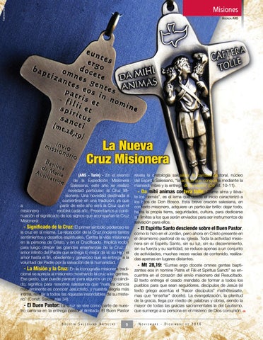 - Da mihi animas coetera tolle: “Dame alma y llévate los demás”, es el lema que desde el inicio caracterizó a los hijos de Don Bosco. Esta breve oración salesiana, en contexto misionero, adquiere un particular brillo: dejar todo, hasta la propia tierra, seguridades, cultura, para dedicarse sin límites a los que serán enviados para ser instrumentos de salvación para ellos. - El Espíritu Santo desciende sobre el Buen Pastor, como lo hizo en el Jordán, pero ahora en Cristo presente en el dinamismo pastoral de su Iglesia. Toda la actividad misionera sin el Espíritu Santo, sin su luz, sin su discernimiento, sin su fuerza y su santidad, se reduce apenas a un conjunto de actividades, muchas veces vacías de contenido, realizadas apenas en lugares distantes. - Mt 28,19: “Euntes ergo docete omnes gentes baptizantes eos in nomine Patris et Filii et Spiritus Sancti” se encuentra en el corazón del envío misionero del Resucitado. El texto entrega el osado mandato de formar a todos los pueblos para que sean seguidores, discípulos de Jesús (el texto griego acentúa el “hacer discípulos” mathêteúsate, mas que “enseñar” docete). La evangelización, la plenitud de la gracia, llega por medio de palabras y obras, siendo la mayor de todas las gracias sacramentales la del bautismo, que sumerge a la persona en el misterio de Dios comunión. Noviembre - Diciembre