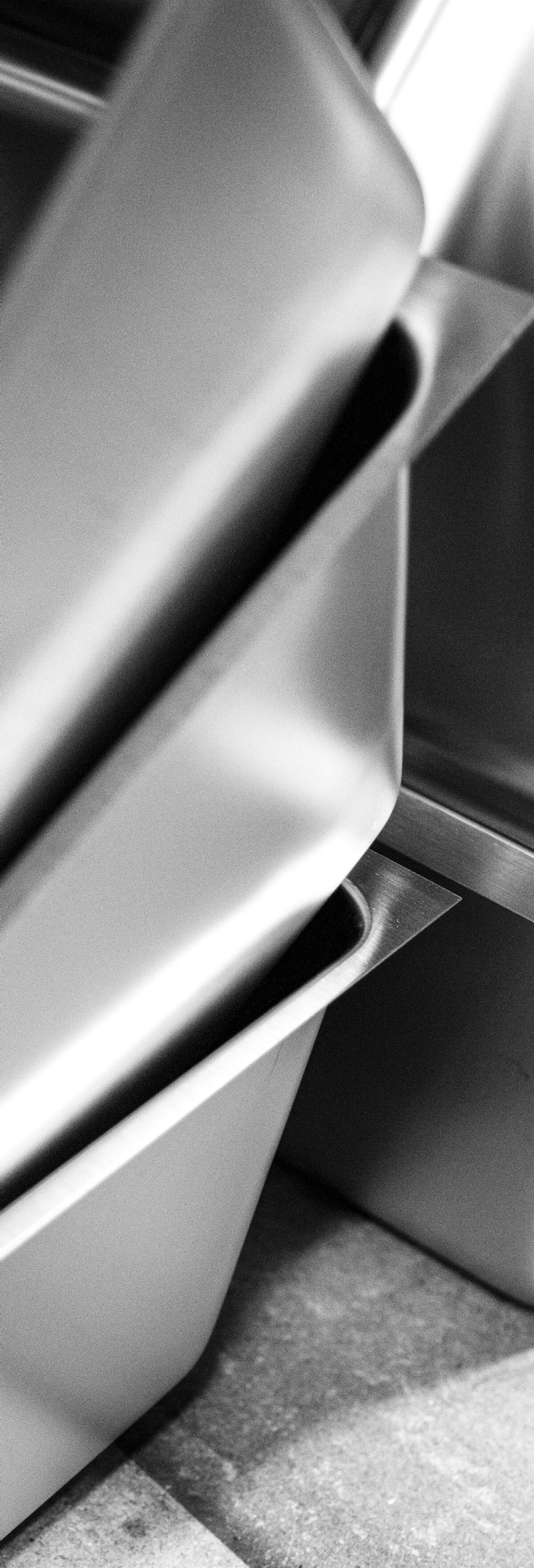 Inne i produktion kan man följa en diskbänk från en unik ritning från en återförsäljare eller slutkund, genom tillverkningen och till att den lastas på en lastbil för leverans. Om du är mer nyfiken på hur en diskbänk tas fram så spana in nästa uppslag. Allt på Decosteel tillverkas från av rostfritt stål, främst från leverantörer i Norden, och man tar råvaran på stort allvar.