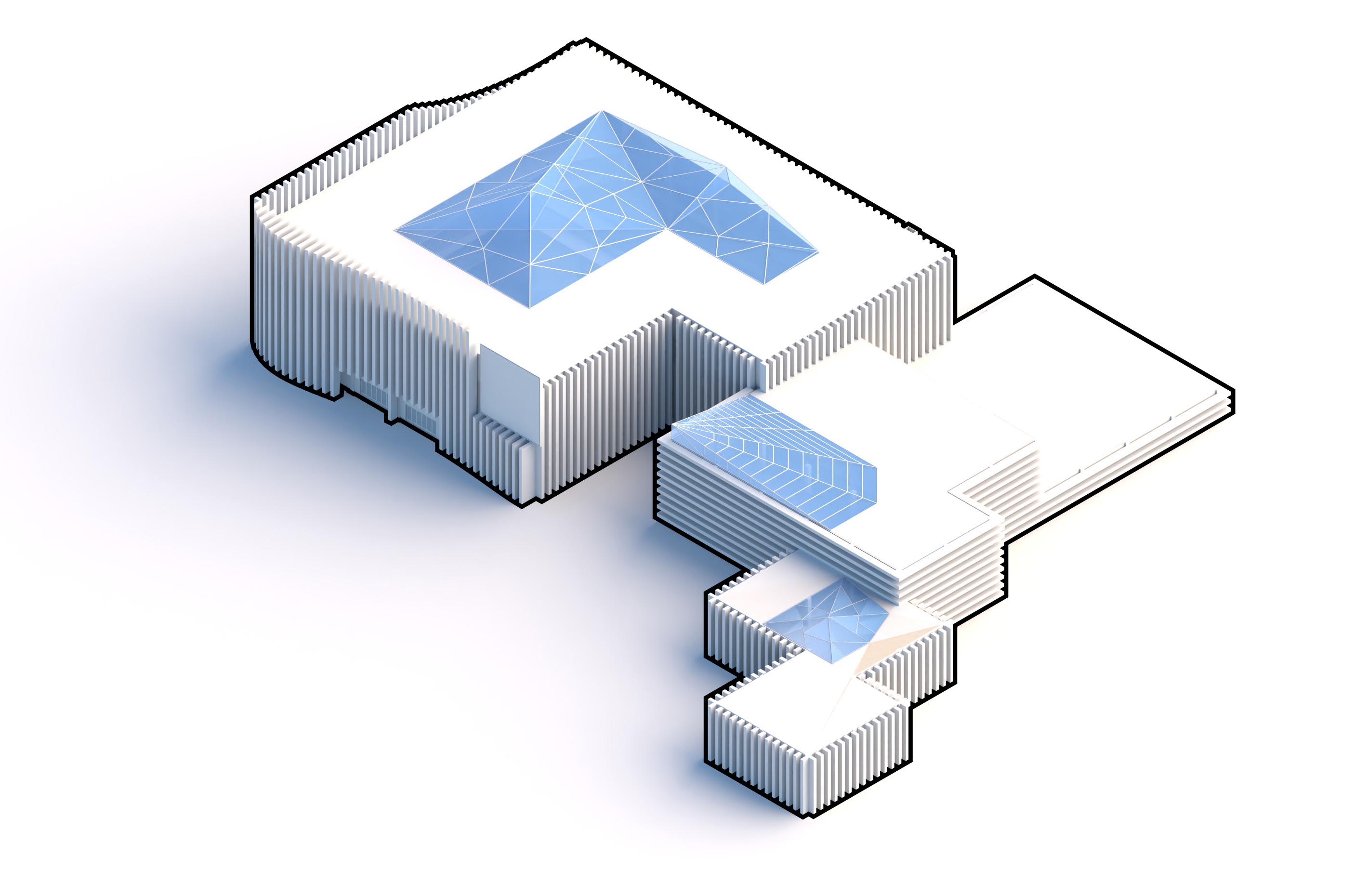 permainan bentukan segitiga yang bertumpuk semakin membuat dan menambah kesan yang sangat dinamis dan ditambah dengan permainan bentukan double skin facade yang berbentuk vertical memanjang yang semakin menegaskan bentuk segitiga yang sengaja ditumpuk. bentukan dengan adanya area rooftop yang luas semakin menambah kesan tentang sebuah bangunan yang terbentuk dari sebuah bentkan segitiga.