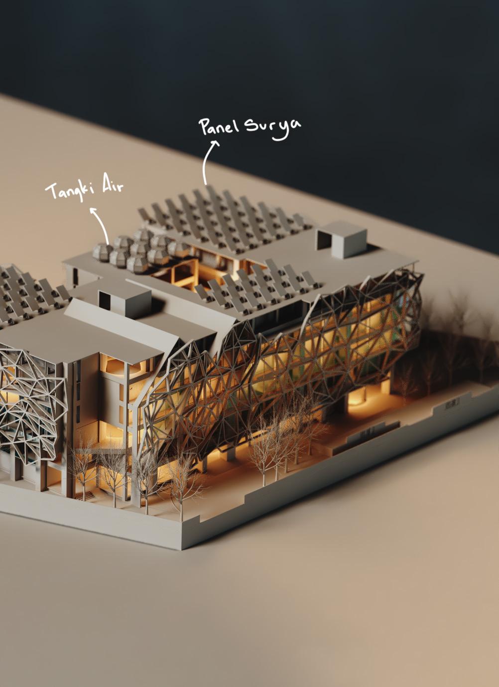 tonjolkan dalam design melalui pemanfaatan sinar matahari energy dalam bangunan, oleh sebab itu bangunan ini juga di rooftop bangunan sengaja dibuat space yang banyak dan