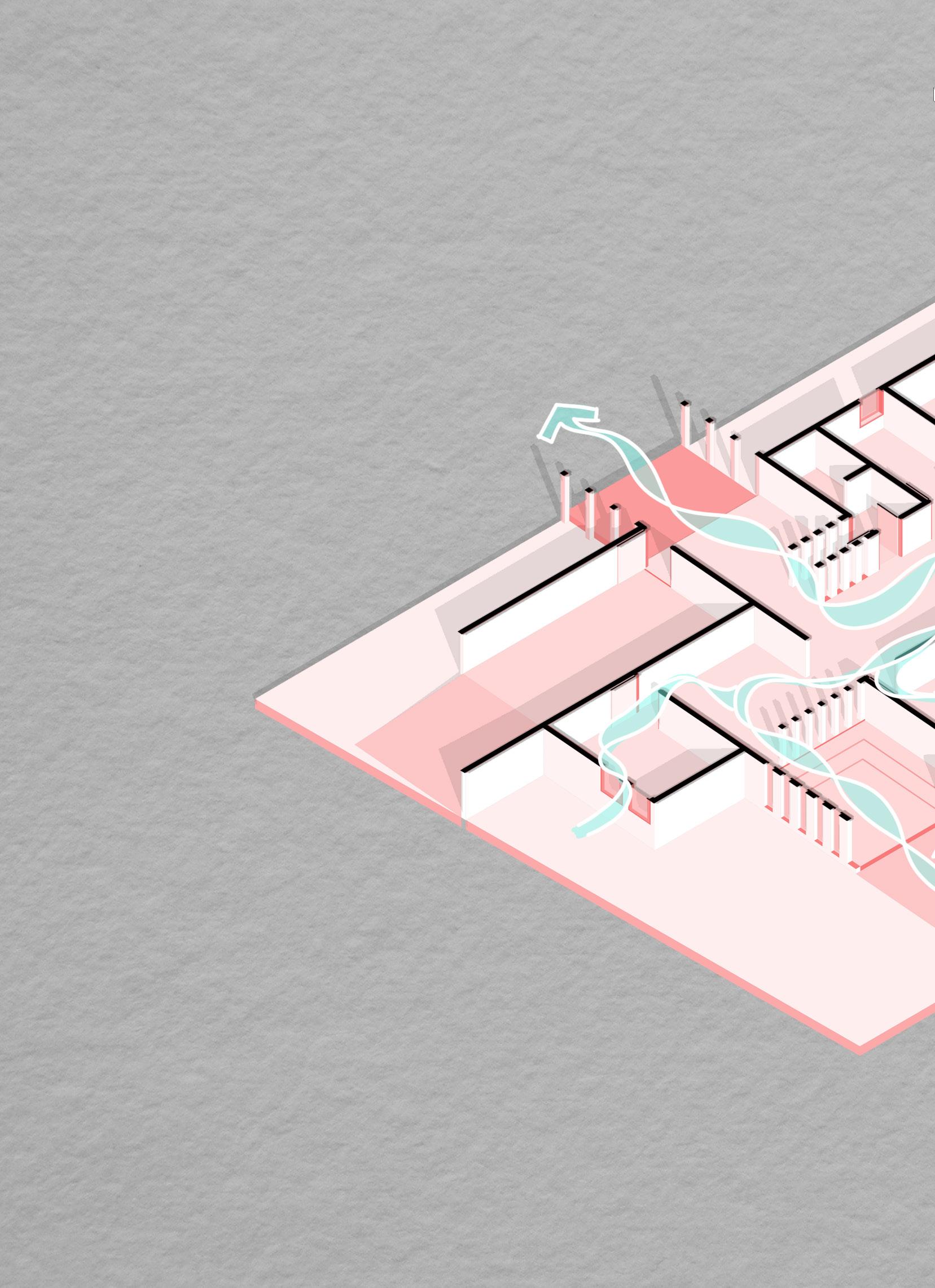 Untuk konsep layout denah dan penempatan ruang seperti yang tampak pada gambar menunjukan bahwa denah dan ruang dibuat sedemikian rupa untuk memanfaatkan windflow atau sirkulasi alur angin sebagai penghawaan alami dan juga penempatan ruang yang ada diusahakan supaya semua ruangan yang ada mendapatkan pencahayaan alami yag optimal.