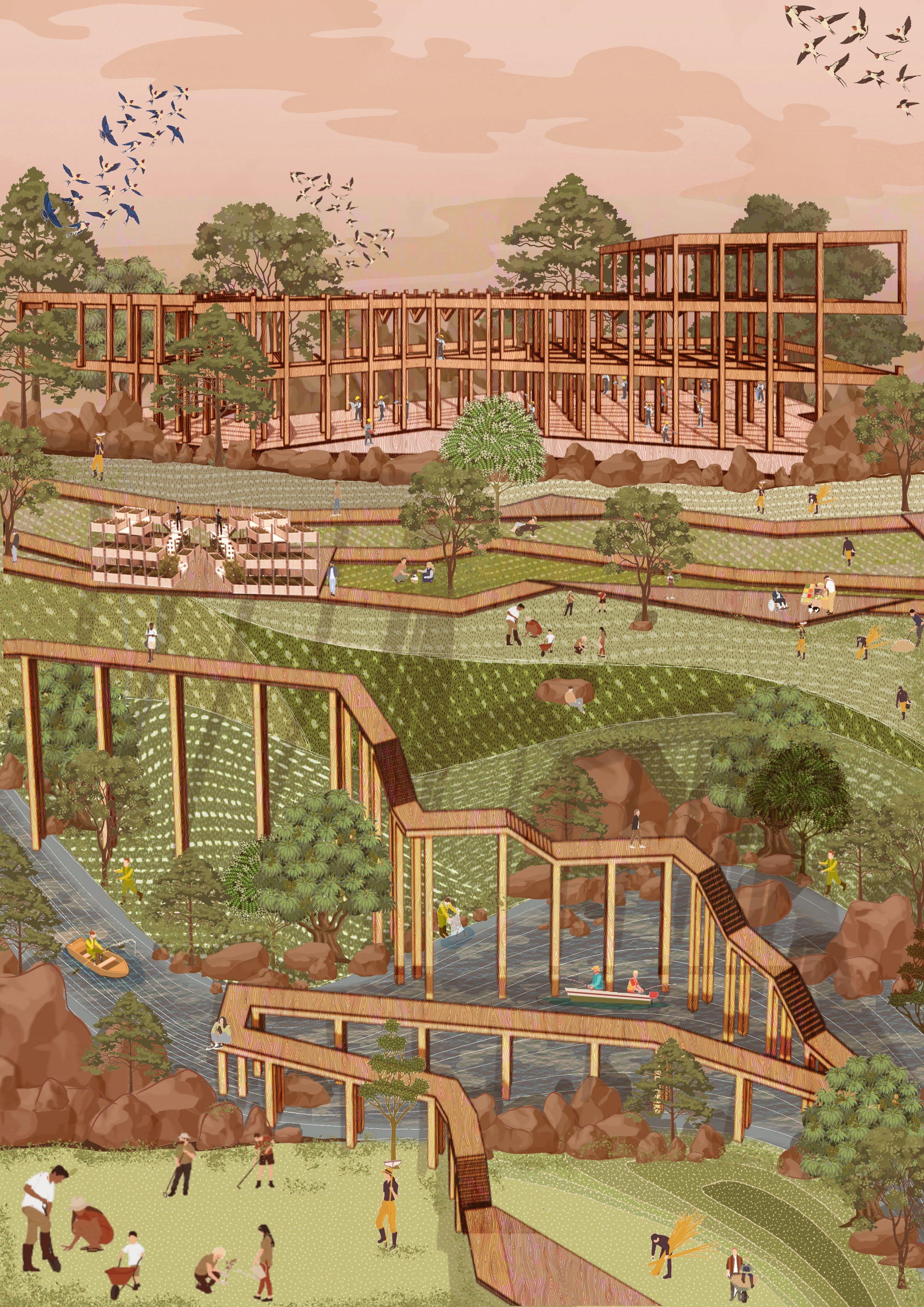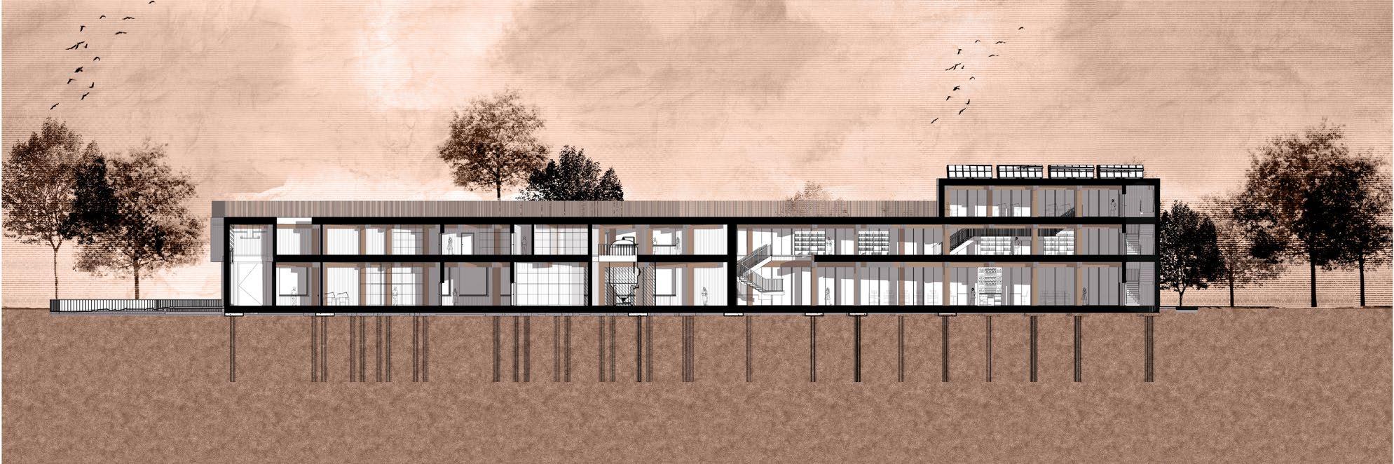 The architecture treats grain as a user, integrating it into both the material and ecological fabric of the building. Energy and water systems are designed to operate through non-human intervention, forming a self-sustaining loop of exchange. Complementary programmes such as a writers’ hub and climate library make the space one of reflection, storytelling, and relearning our relationship with the natural world.