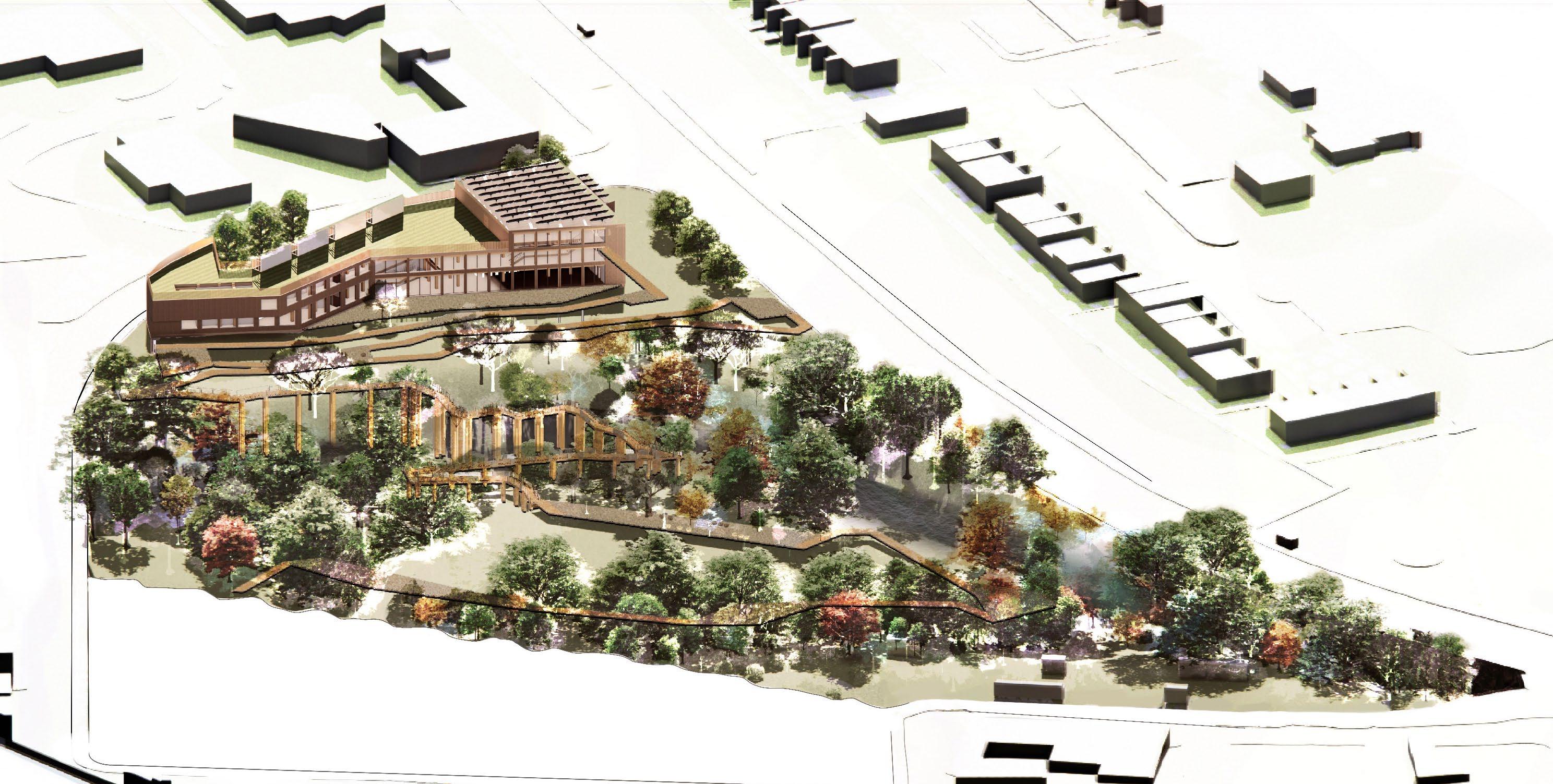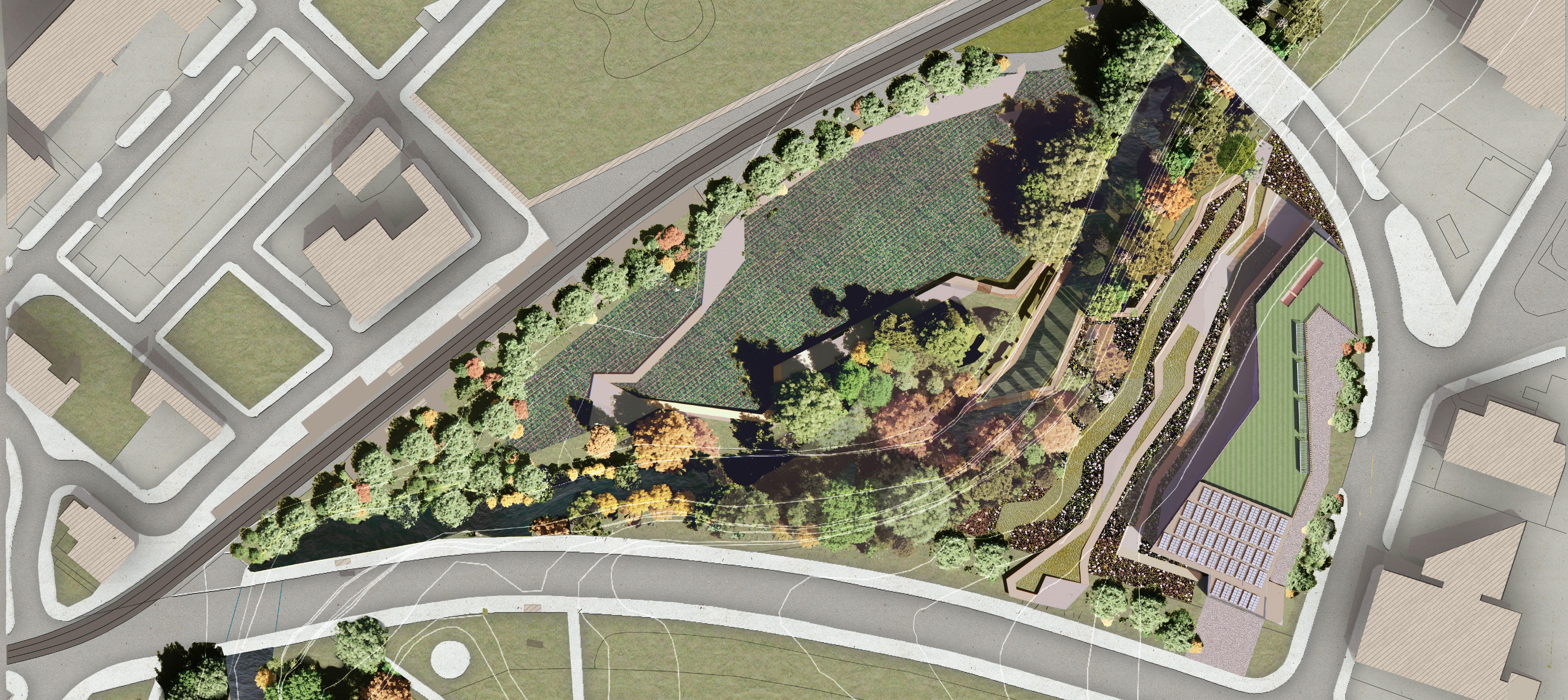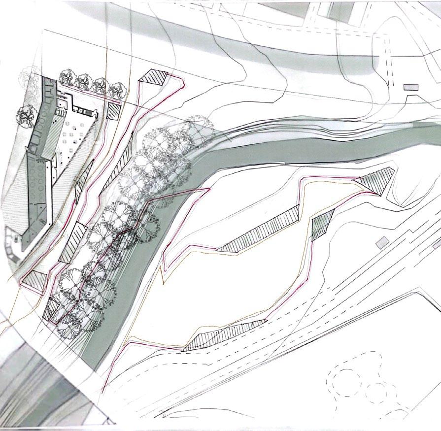 The landscape aims to put to practise the ideas promoted by the brewery. The walkway winds around the existing contours and the topography of the site. This controlled and deliberate circulation creates moments of interaction between human and non human species. Encouraging a slower, more conscious engagement with the terrain and its non-human inhabitants.