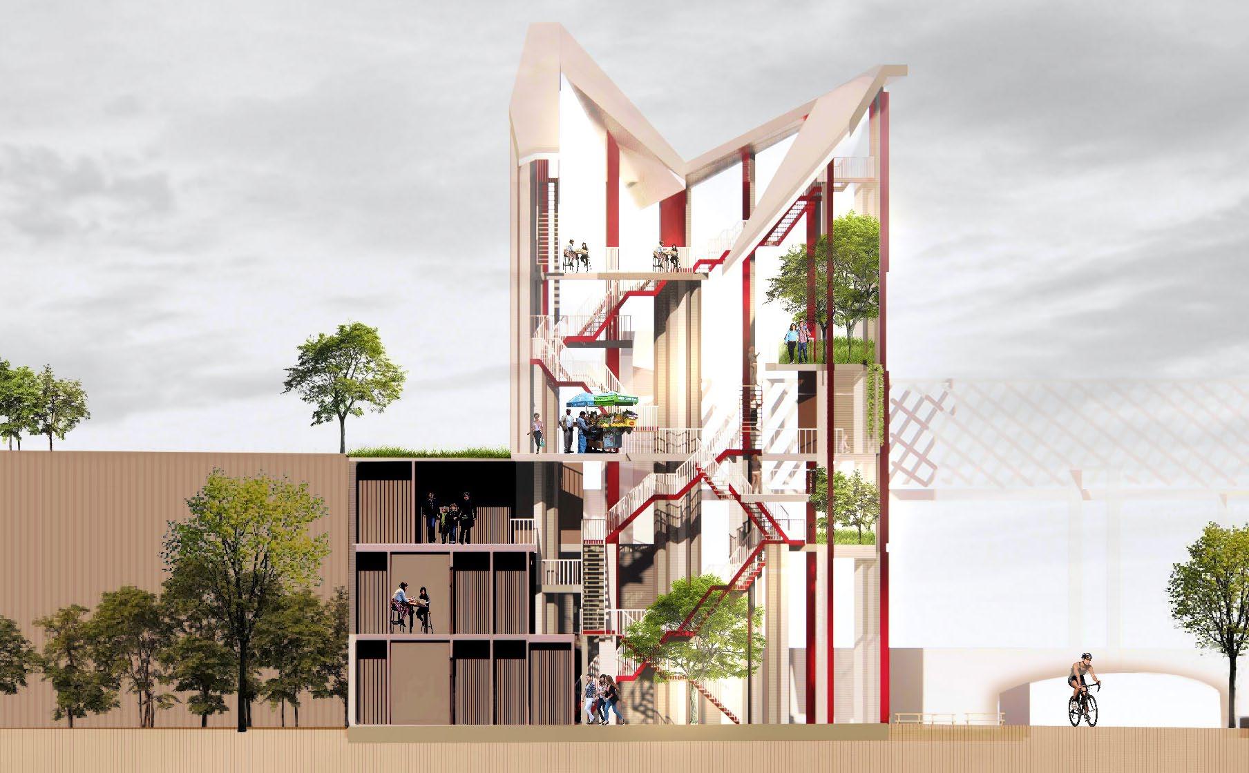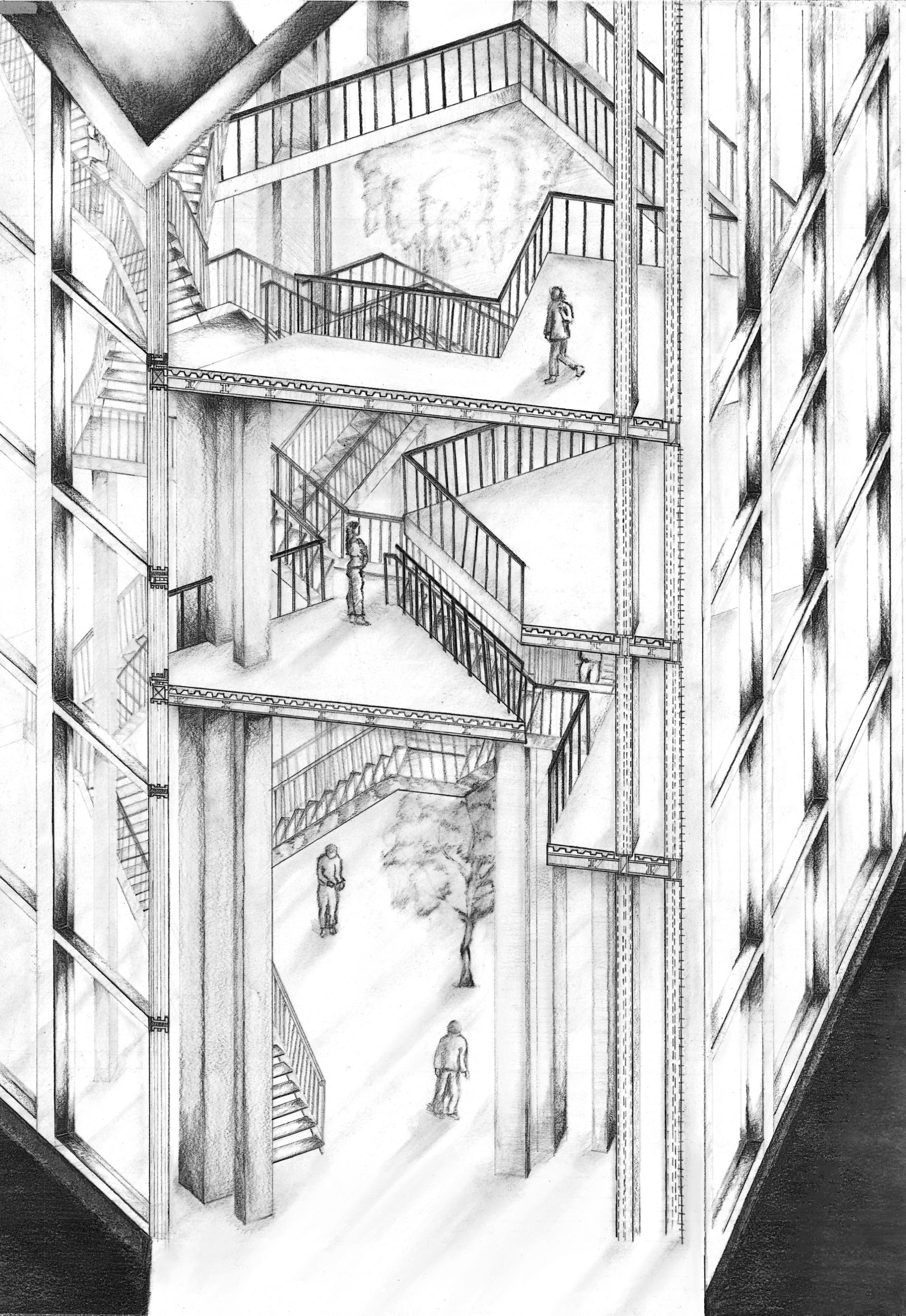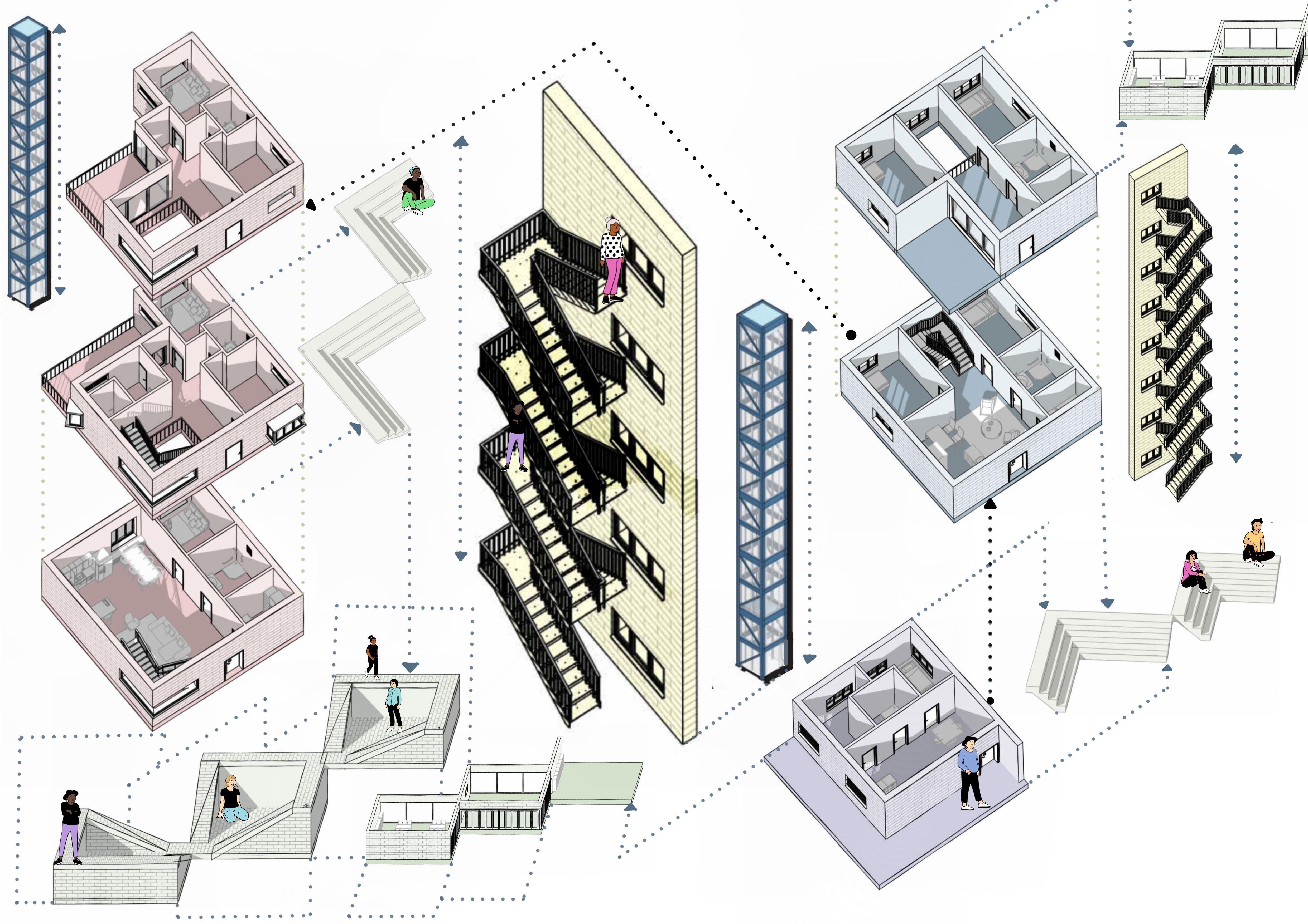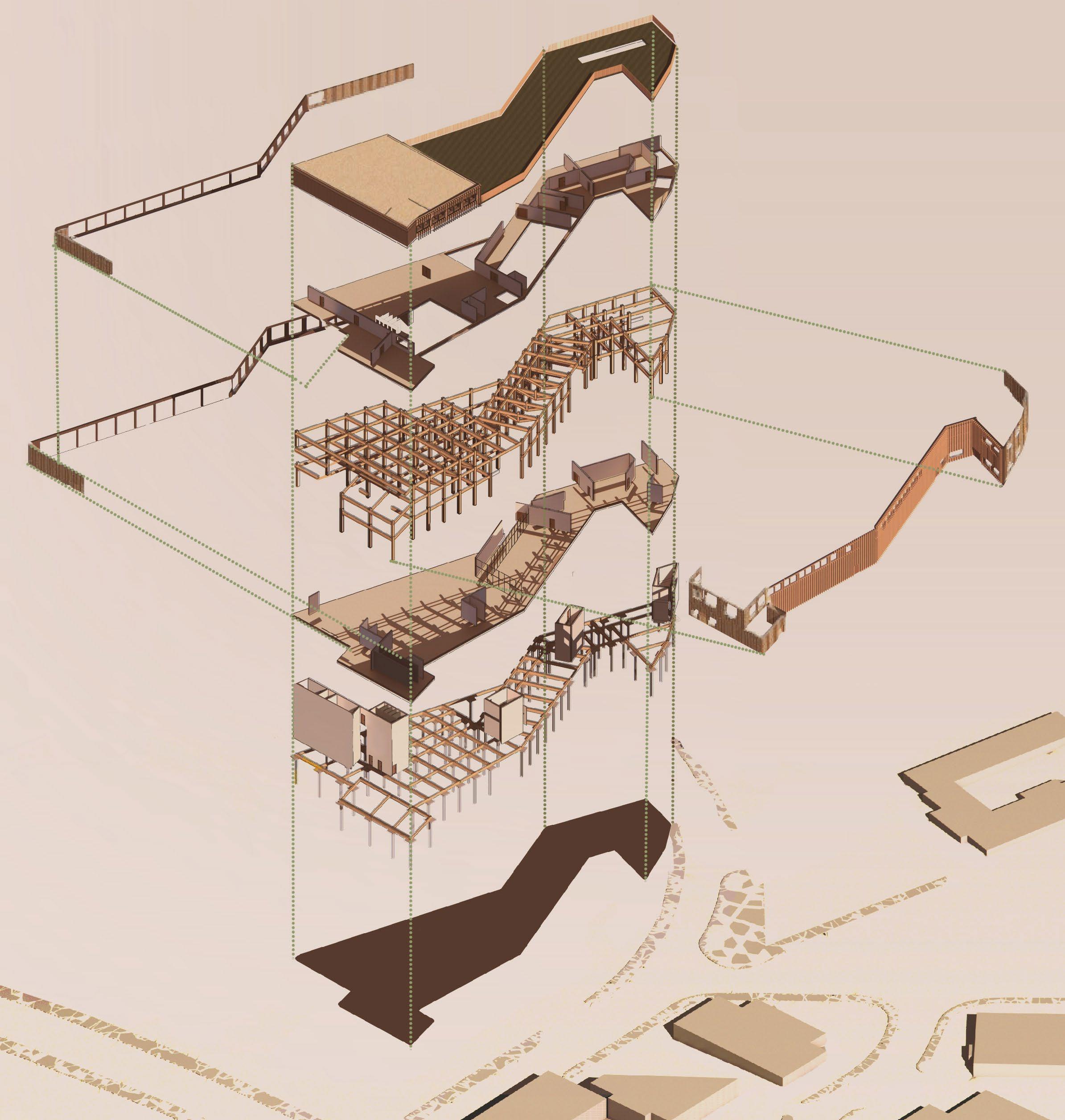 The proposal is situated in a historically charged site in central Manchester, where a well-known red staircase and the surrounding industrial structures form a core part of the area’s identity .These visual cues of the arches, viaducts, and stairs became a mnemonic device to turn the site’s nostalgia into a spatial driver for activating collective memory.