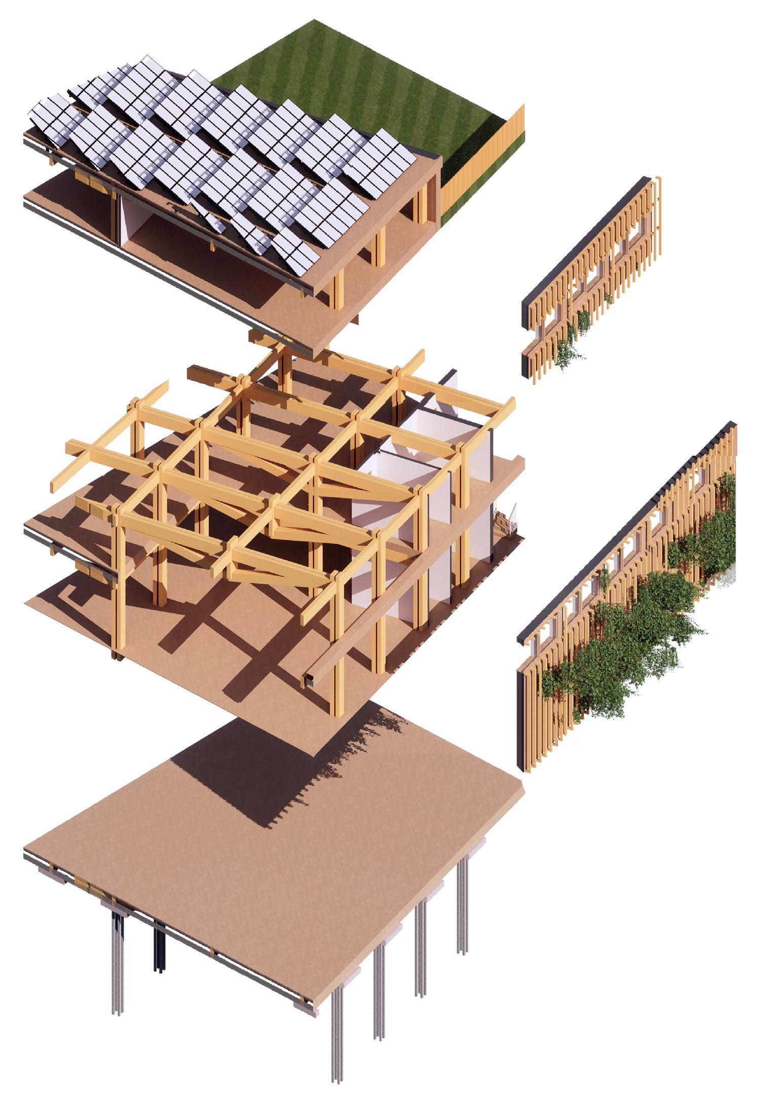 It further explores the wall unit itself and how best to achieve an environmentally responsive facade that meets passive haus standards. The building considers grain as one of its users so the materiality of the building reflects this. Miscanthus grass boards replace standard osb boards. The Strawbale insulation is build up around the Larsen truss system. This allows for thick layers of insulation to be erected while maintaining no thermal breaks .The MGBs act as bracing on either side of the insulation and aid in transportation. All additional battens and counter battens are timber. This is contrasted in the building through the use of steel bracing and fixings. The use of the double timber columns and mass timber structure in general feature the irregular structure grid as the aesthetic language of the building. All materials are locally grown on site creating a site specific identity for the building and recalls the industrial typology of the microbrewery through the exposed structure.