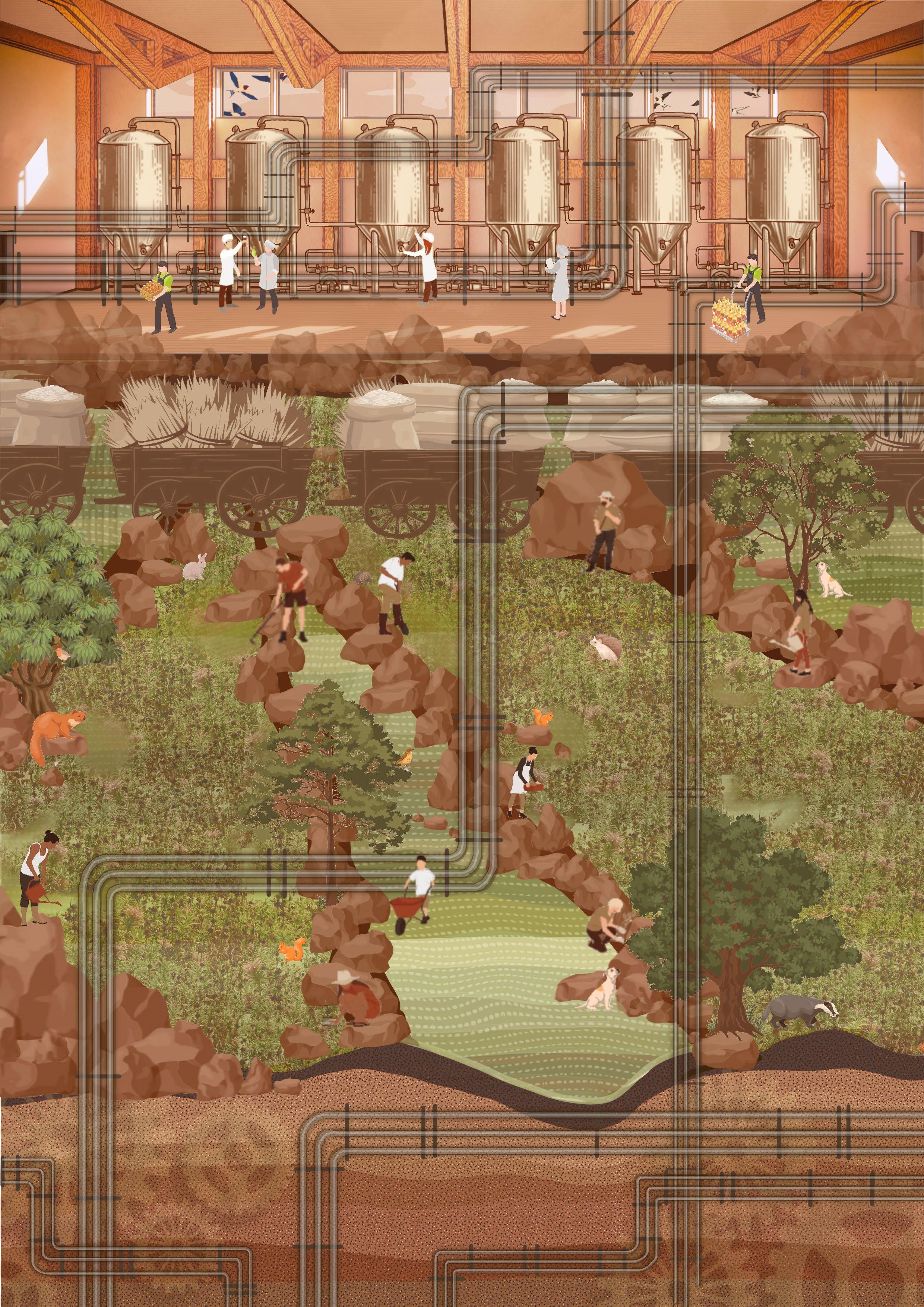 The proposal seeks to reconnect the community’s everyday rituals with the urgent realities of the climate emergency by framing beer - an object of collective value - as a reminder that “there will be no beer if there is no ecosystem.” Centred around a microbrewery, the project uses the brewing process as an educational and experiential tool, revealing how deeply human life is intertwined with non-human systems of growth, fermentation, and decay.