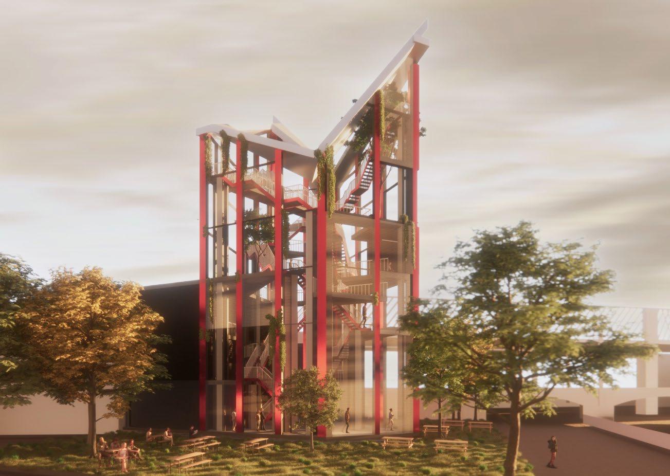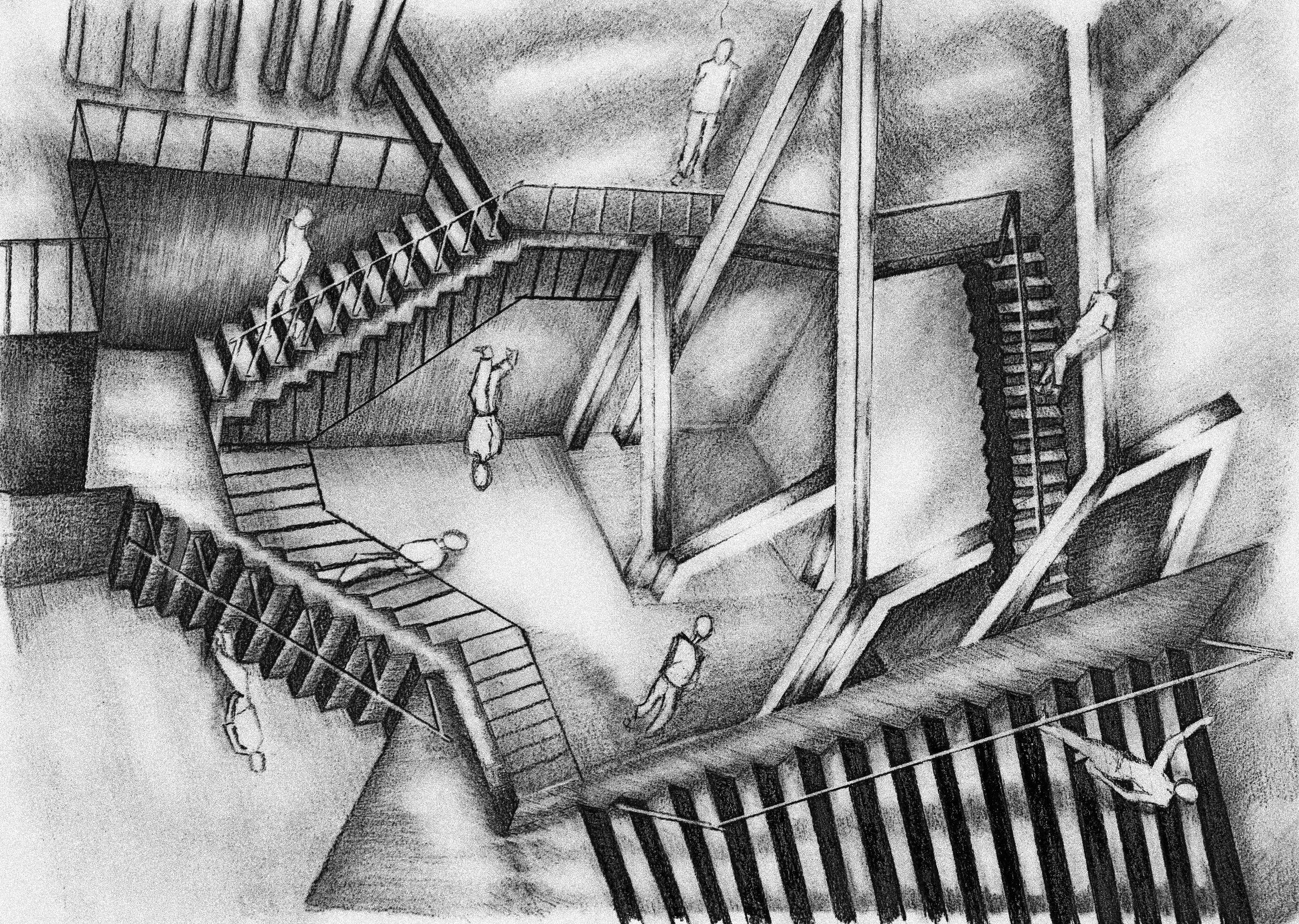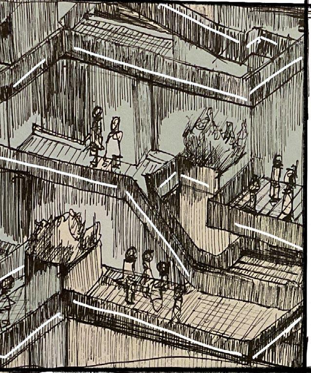 The project reinterprets this cinematic descent into a built experience. The architecture creates an optical illusion of disorientation through intersecting stairs, concentric arched columns, and recursive sight lines. Drawing from the imagery of M.C. Escher to produce a continuous, looping vertical journey. Circulation becomes a narrative device, guiding visitors through a sequence of deliberate sensory thresholds that reconnects users to the act of exploration. Users are confronted with the vibrancy of fresh crops, the aromas from kitchens, and the layered sound-scape of the marketplace. Across the building and landscape, moments of interaction are curated to encourage visitors to pause, participate and support place-making through repeated, shared encounters.