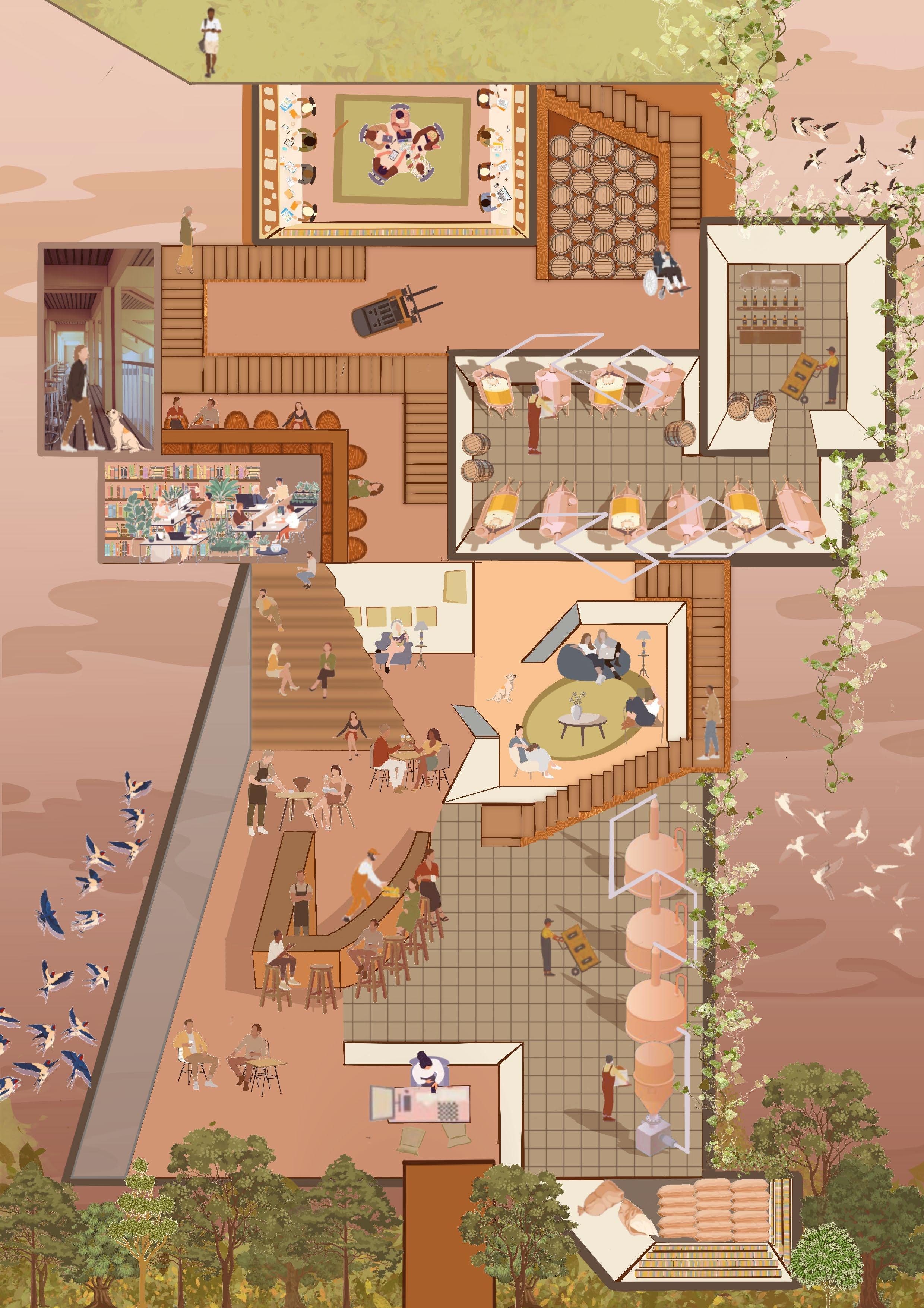 Ultimately, this is not a brewery; it is a speculative dwelling for an entangled future, where circulation follows the story of the grain. Humans become one of many users in a Post-Anthropocene ecosystem, guided by yeast, bacteria, and fermentation as spatial narrators.