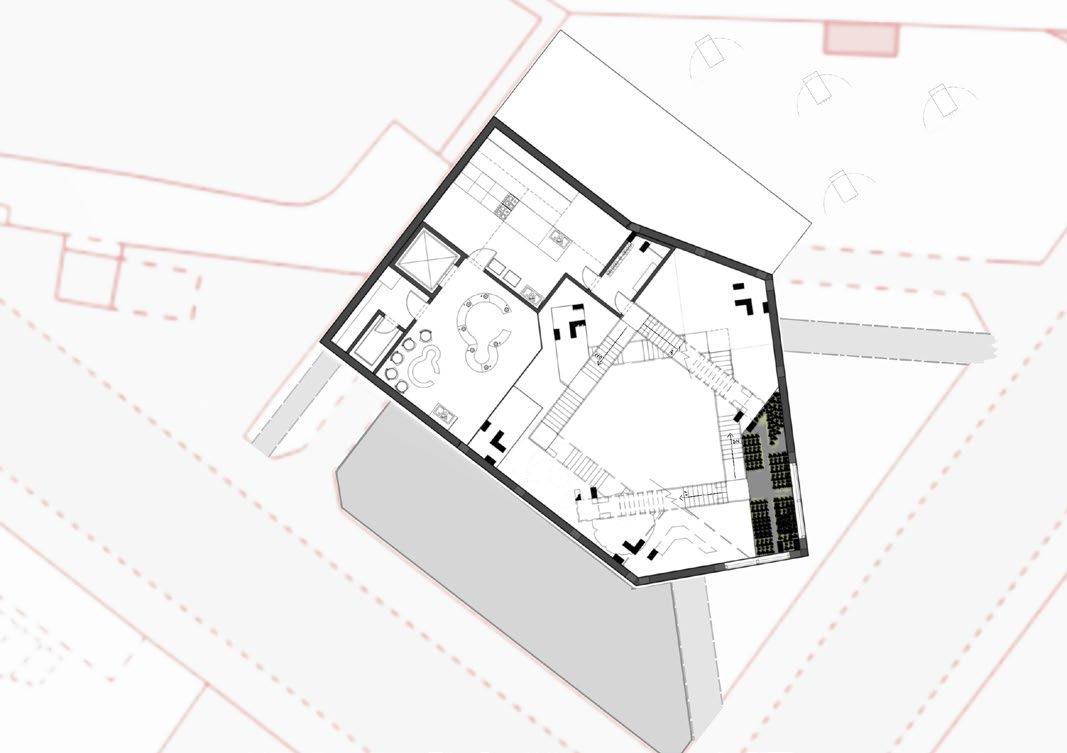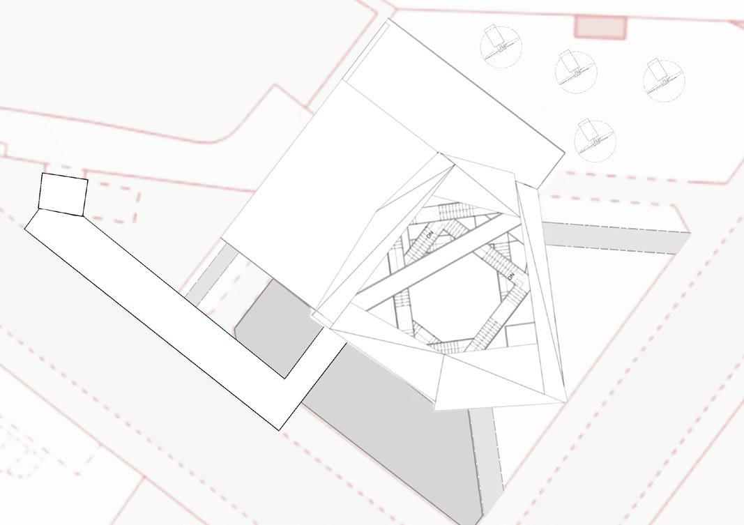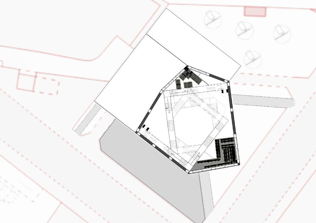 To remain faithful to the central imagery, the entire building was conceived as an extension of the staircase itself. The stairs, together with the columns, establish the structural grid, modernising and reinterpreting the site’s iconic arches. Layered through the building’s height, these elements form a vertical sequence reminiscent of the concentric arches found on site, while in plan they echo the geometry of the falling vortex.