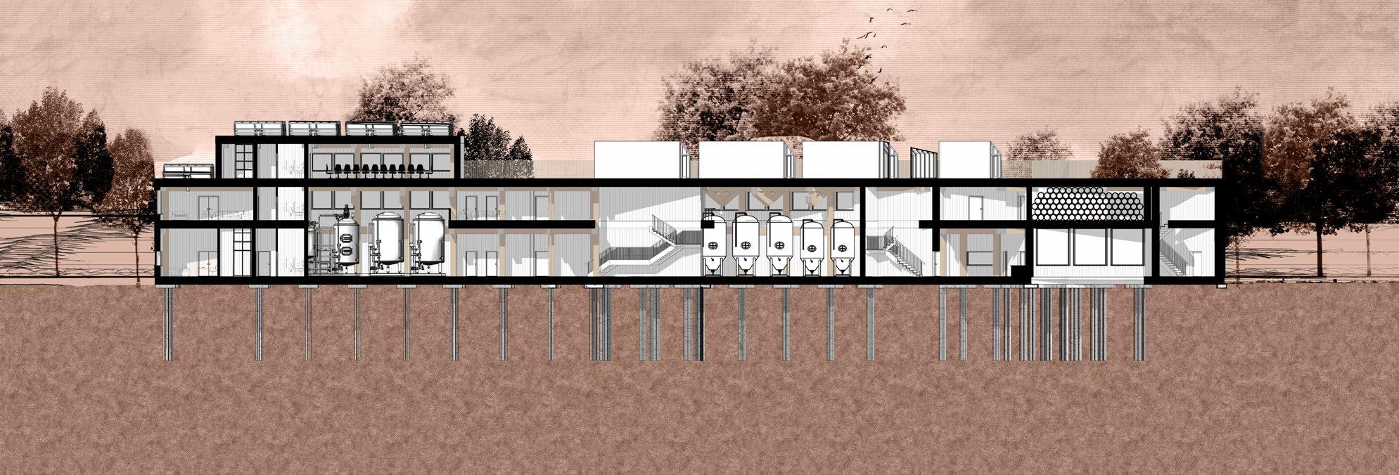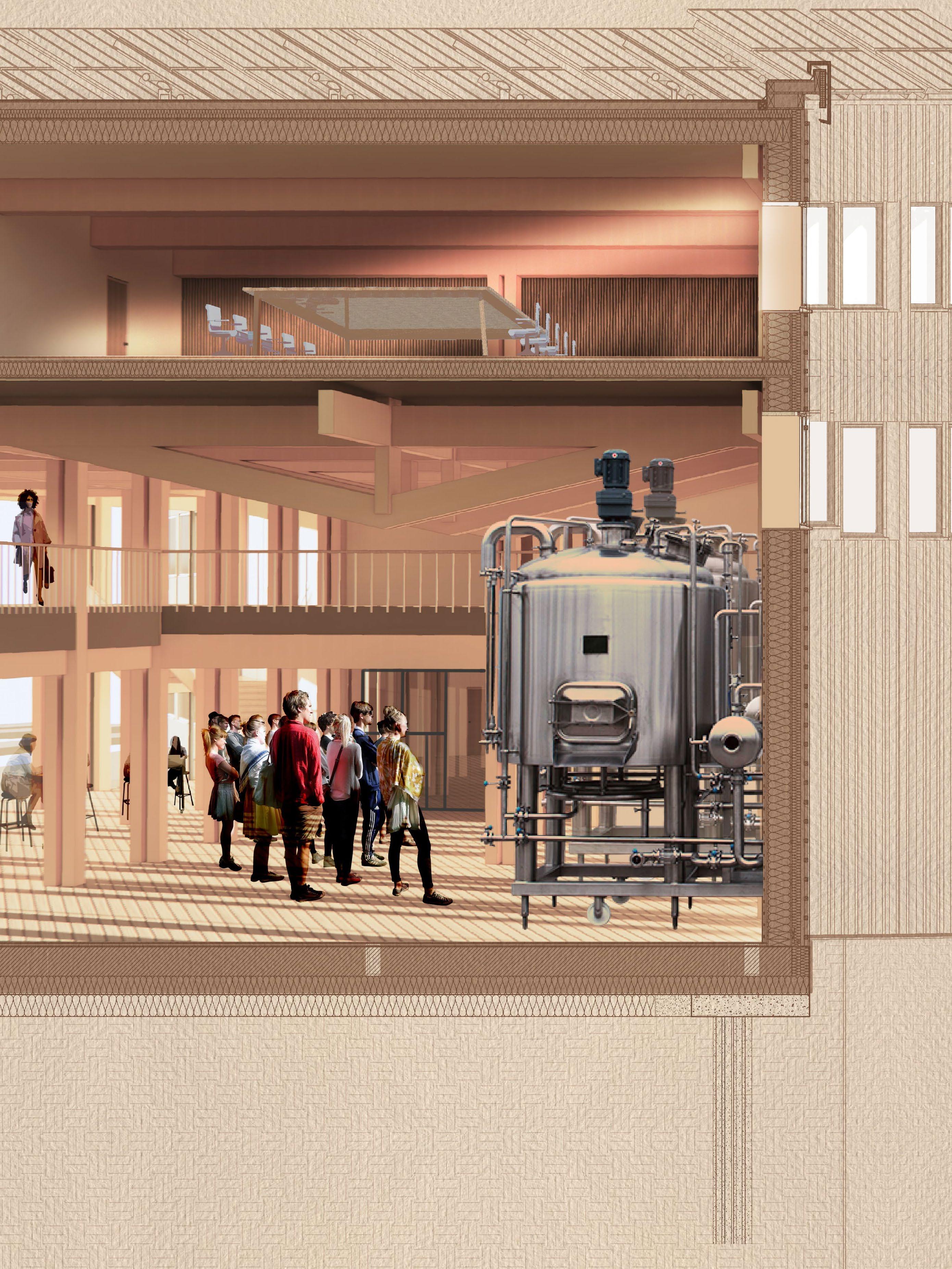 The study of the brewing activity becomes a tool to uncover the microecologies operating throughout the process. By breaking down each stage from malting and mashing to fermentation and conditioning it became clear that brewing is not a human process but a collaboration between multiple non-human agents: yeasts, bacteria, fungi, grains, and water. Each micro-organism’s contributions dictate the character of the final product. This reading of the brewing process as a living ecological network informed the architectural response, encouraging a design that not only acknowledges and supports, but is lead by the actors within the building’s spatial and environmental systems.