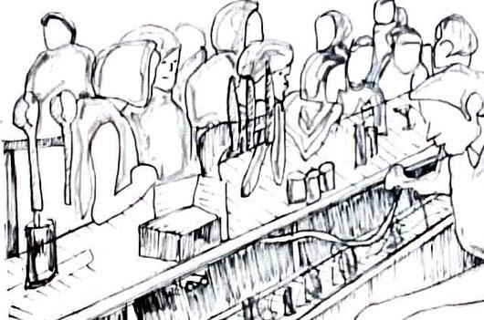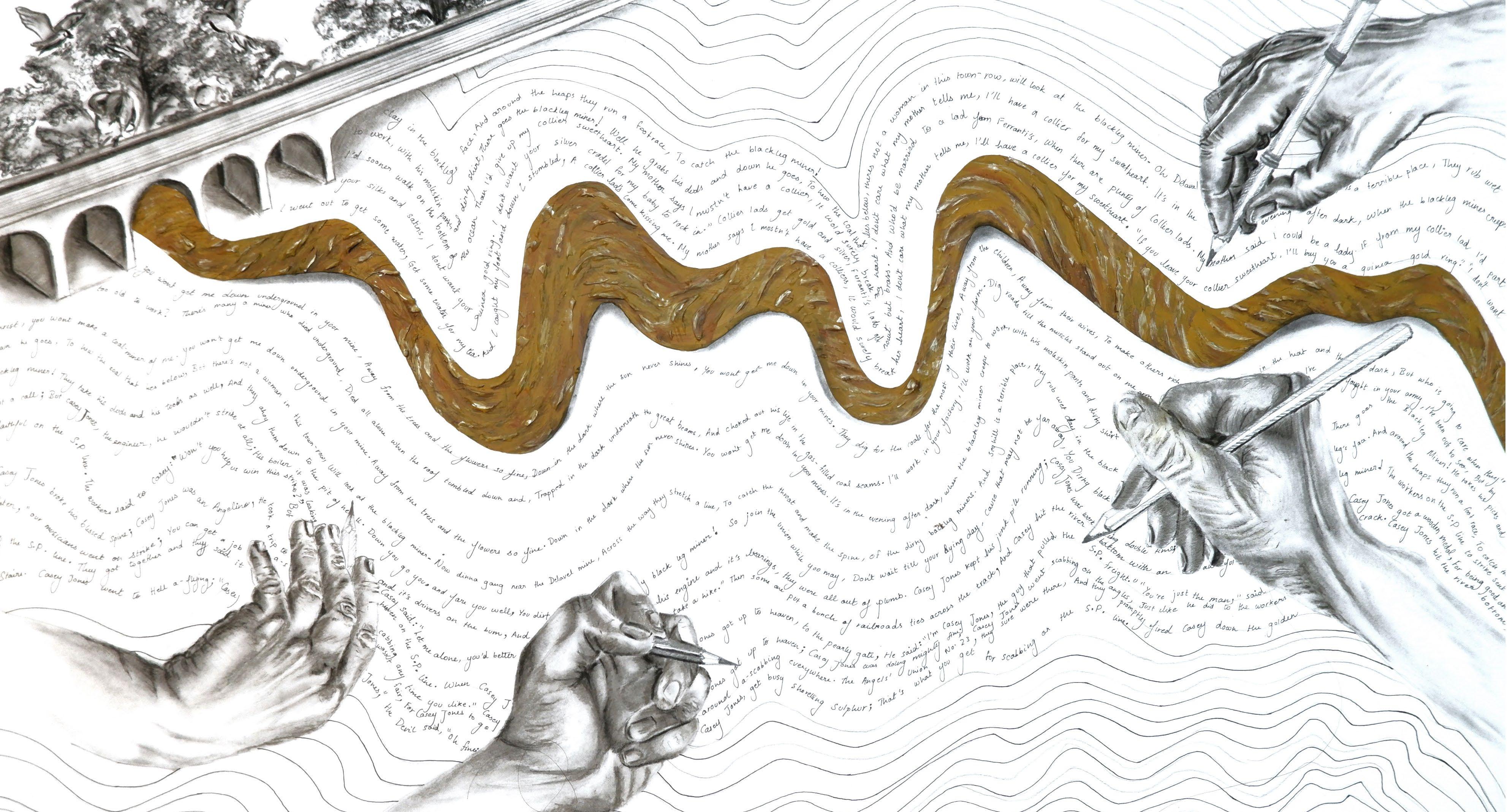 As the image is unrolled so are the miners’ songs, each with a different story, sung while working long hours to build a sense of community. The songs themselves convey stories of the miners and their communities, the act of hands engraving the songs into the contour lines of the site mirrors the lasting impact left on the land and ecology by the miners Today this manifests as altered ecosystems, climate change and polluted rivers caused by the industrial period. The river here absorbs the songs in an attempt to show that “water has memory” and acts as an archive for human activity. Within the piece nature and animals have been marginalised and pushed to the back to mirror the place nature took during this period, and to an extent still continues to take. The distorted proportions, especially with regards to the human hands reflect the disproportionate and immense effect humans have had on the land.