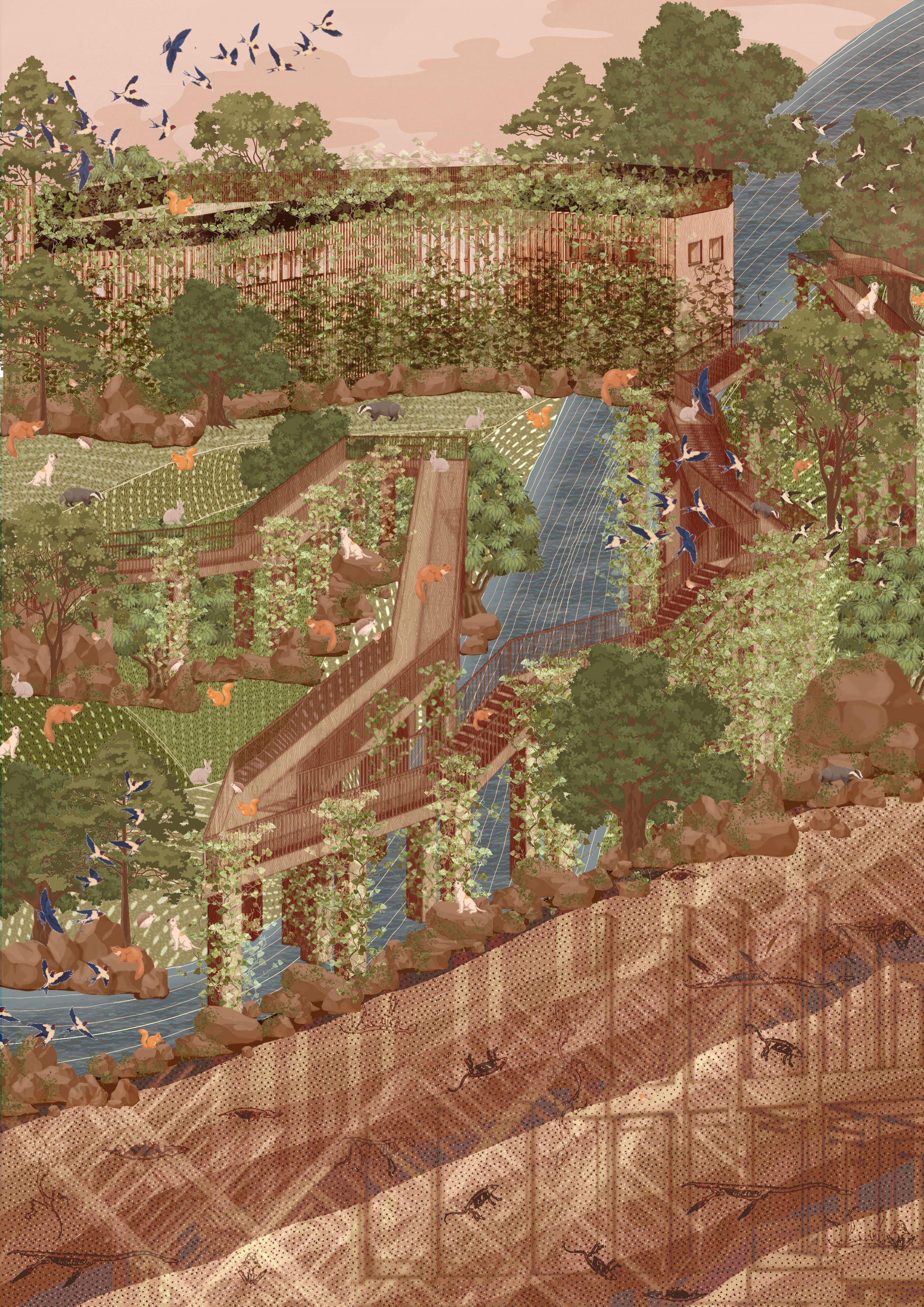 Kevin Lynch’s five elements describe how people form a mental image of the city. In this proposal, the framework is reinterpreted through a non-human lens, where districts become ecosystems, nodes become habitats, and other elements translate into ecological systems and movements.