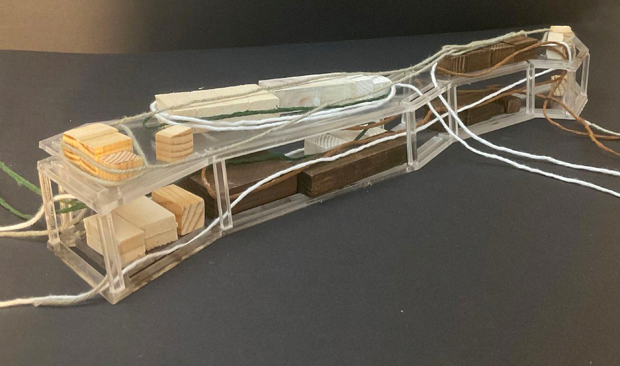 Blocks of equal area to the spatial diagram were used for accuracy - dark wood representing brewing zones and light wood representing social spaces. The circulation strategy positioned human movement in response to nonhuman movement, allowing the design to follow existing ecological flows. Different coloured threads were used to map, layer, and test circulation routes, weaving through the model repeatedly to trace overlaps and divergences until a cohesive and intuitive routes emerged. This process reinforced the intent of creating a building that learns from the ecologies it houses.