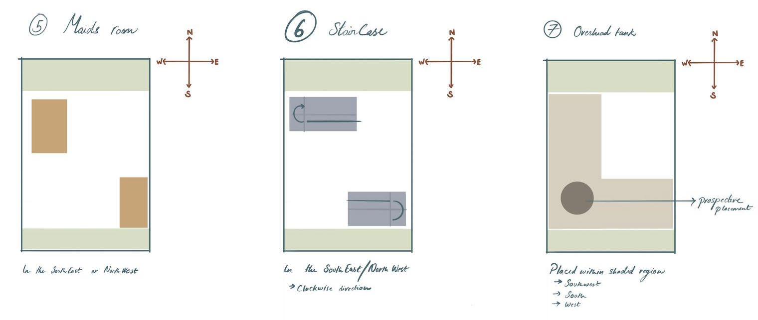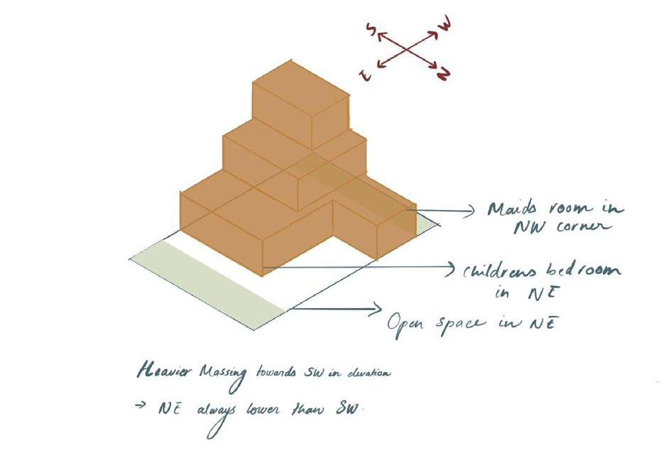 The project is further guided by Vastu principles, which shape zoning, and orientation. The house is planned to allow users to “follow the sun,”. Through the conceptual development process, I identified that north-oriented plans could be mirrored to achieve east-compatible layouts, just as south-facing plans could be mirrored to work in west-facing configurations. This allowed the villa typologies to remain Vastu-compliant across multiple plot conditions while maintaining a cohesive architectural language.