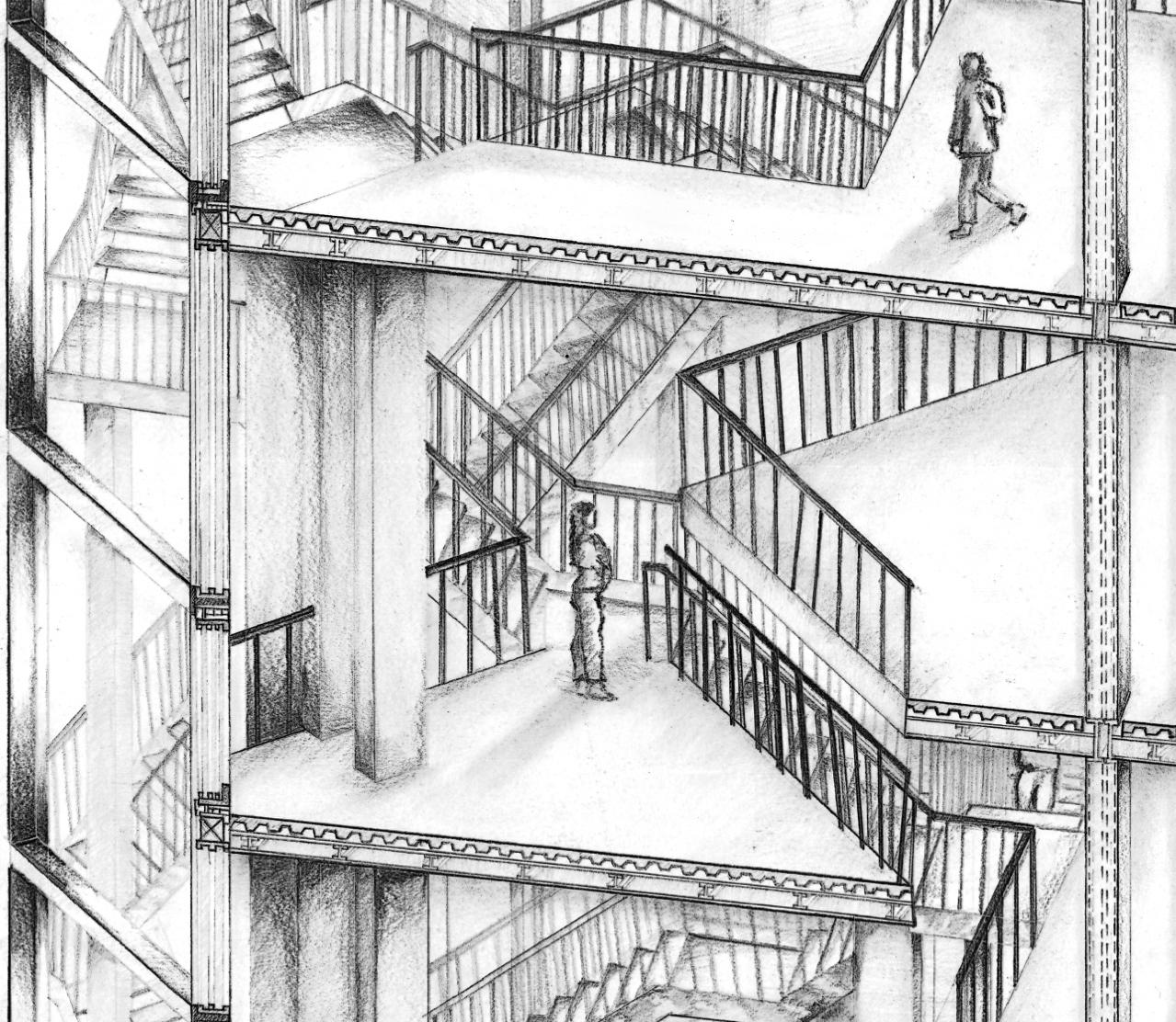 SIGHT Along the staircase, shifting sightlines play opticalillusions The industrial language of the viaducts shape the architectural language of the building and get in-cooperatedintotherailings The concentric arches on sitebecomethestructural languageofthebuilding