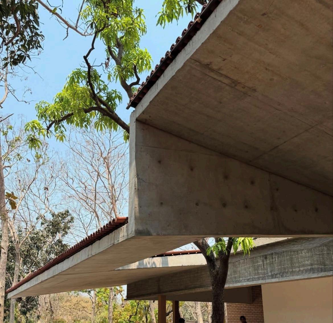 The design reinterprets one of the most recognisable elements of the South Indian house: the pitched roof. Here, it is imagined as if gently pressed downward — a form reshaped by a point of tension. The resulting flattened geometry radiates a fan-like pattern of rafters that pay homage to the original roof while allowing light, ventilation, and spatial porosity to define the interiors. Courtyards and staircases anchor the typology, reinforcing the vernacular lineage while creating intimate microclimates within the homes.