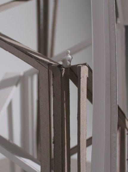 With the structure established, a 1:10 model was constructed and tested to observe how light and shadow moved through the stair assembly, and to identify where the ergonomics of the form could naturally support landings. These observations worked together to inform how each landing would be integrated into the structure, shaping moments of pause in response to both supporting function and user comfort.