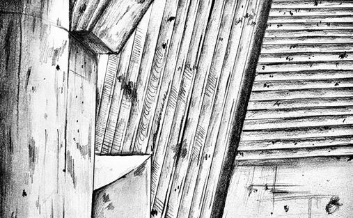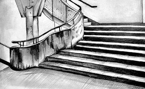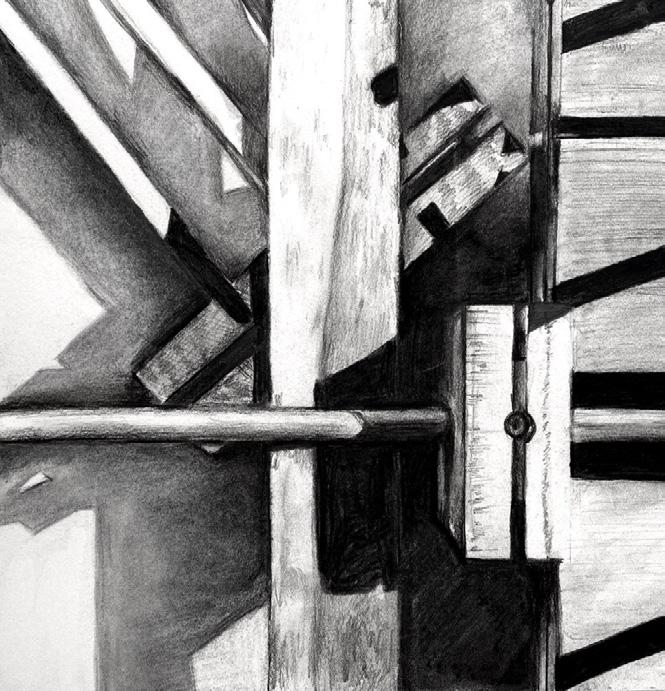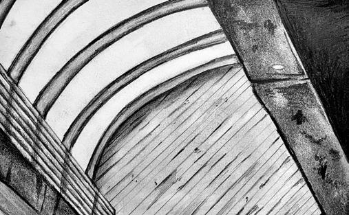 traditional; charcoal on bristol; (i) barrel vaulted ceiling; (ii) cannon chapel; (iii) stair anatomy; (iv) material study