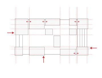 2. The interplay between the positioning of blocks (or “units”): creating “nooks” for residents to interact with neighbors [(d), (e)] or blocking certain paths for dynamic circulation [(b)]