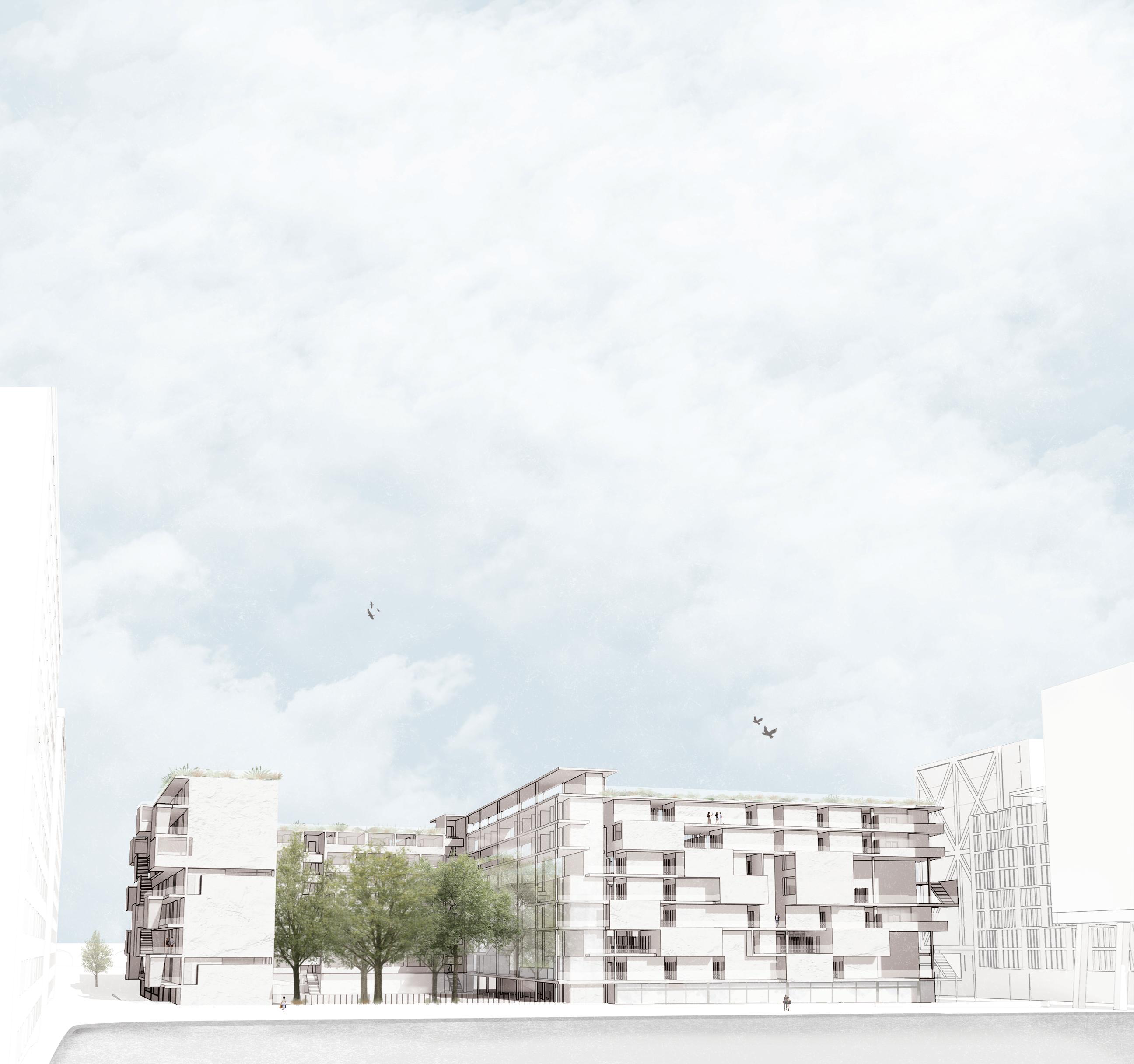 3. A sleek, centralized space (“Glass Tower Commons”): connecting the two main masses while serving as a social hub for residents [(c)]