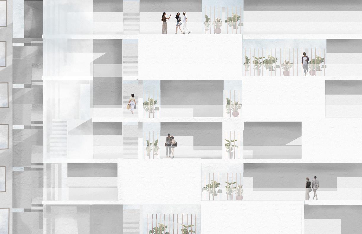 the first floor features an outdoor art gallery that not only serves as a divider of programs but also allows pedestrians to cut corners during their commute