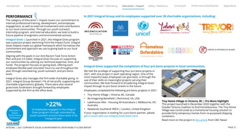 The category of Education + Impact covers our commitment to internal professional training, development, and employee engagement, as well as external involvement and contributions to our local communities. Through our youth outreach, internship program, and internal education, we look to build a future pipeline of engineers and environmental activists. Integral Gives | Launched in 2021, the Integral Gives program was a passion project stemming from the Impact Fund. Integral Gives helped create our global framework which formalizes the commitment and approach we use to giving back to our local communities. Aligning with the goals in our Anti-Racism Task Force Action Plan and Just 2.0 Label, Integral Gives focuses on supporting our communities by utilizing our technical expertise, time, and funds. The program focuses on giving back, offering each employee flexible paid volunteer hours to use throughout the year through volunteering, youth outreach, and pro bono work. Integral Gives also manages the firm-wide charitable giving. In 2021, Integral Group donated >1% of net profit, supporting ten charitable organizations globally. There were also several grassroots fundraisers brought forward by employees supported by the firm at the office level.