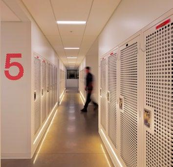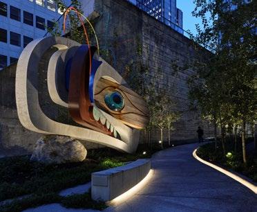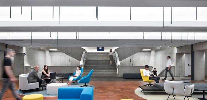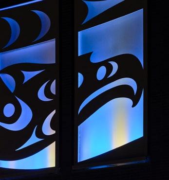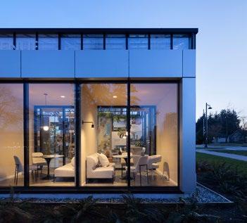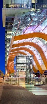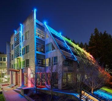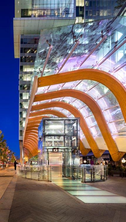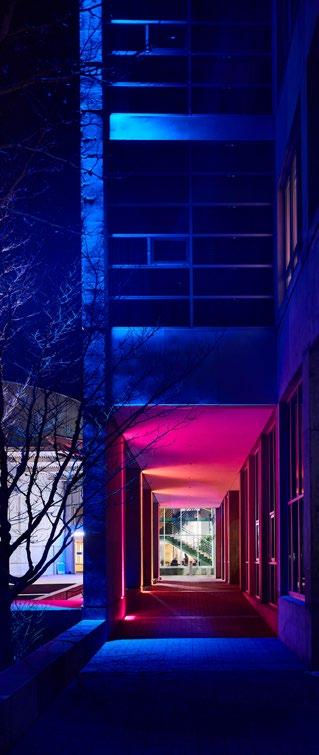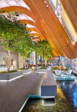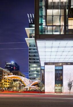 The building’s glass curtain wall offers stunning views of the outdoors, and the lighting highlights key exterior features like trees and V-columns, creating a layered backdrop that connects interior and exterior spaces. The DALIbased control system adjusts pre-programmed lighting scenes throughout the day, enhancing the user experience. The illuminated interiors contribute to the vibrant atmosphere of downtown Vancouver’s public commercial spaces.