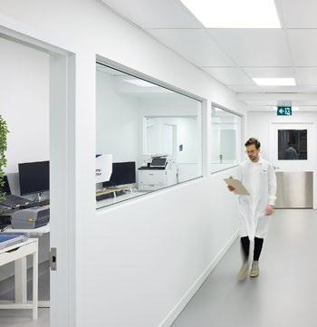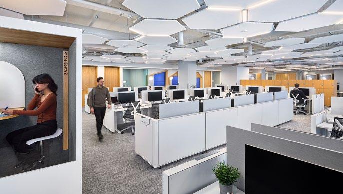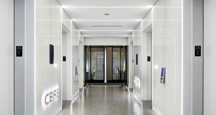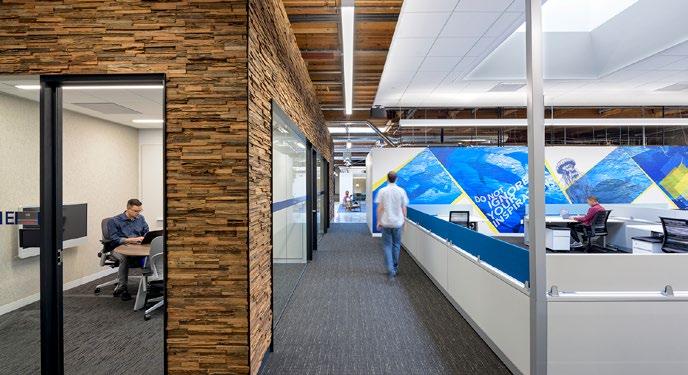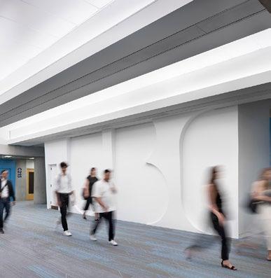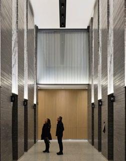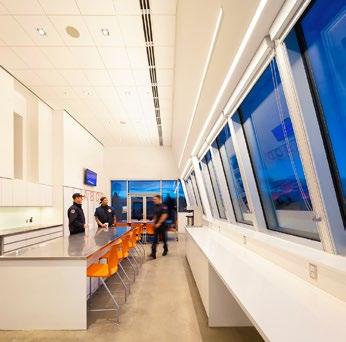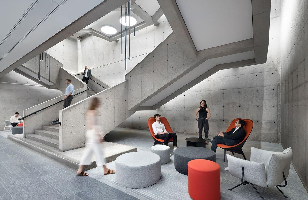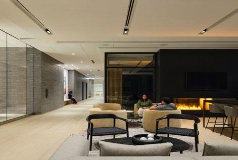 Discreet downlighting provides functional light and serves as a neutral backdrop for sculptural decorative fixtures, enhancing the overall design. This facility embodies a forwardthinking vision, positioning the client for continued success and innovation in a rapidly changing industry.