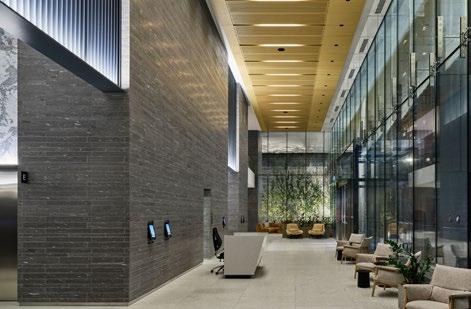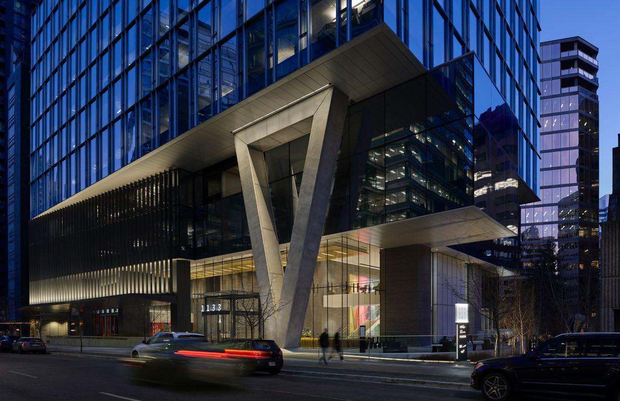 The 37-story office tower is North America’s first zerocarbon high-rise commercial building, boasting a unique design of four offset stacked boxes that create a twisting form atop a podium. A V-shaped column supports the cantilevered upper floors, while a black metal veil adds texture to the façade. At ground level, a pocket park with a large-scale art installation offers a green retreat.