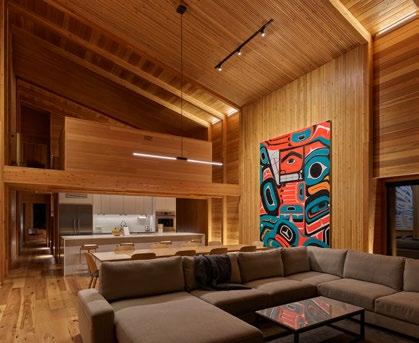 Key architectural elements emerged early in the process, including a distinctive torqued wood ceiling in the doubleheight kitchen and gathering area. Discreet low-voltage track lighting was integrated along the angled beams, creating a strong visual impact while providing essential illumination for events. This integration emphasizes both functionality and aesthetics.