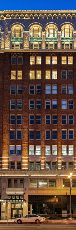 The 12-story commercial office, designed by Allison Architects in 1925, showcases Italian Renaissance architecture, featuring a prominent loggia, ornamental finishes, and fire escapes. The facade blends terracotta and bricks, with a striking 11thfloor green copper element accentuating the loggia.