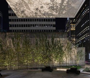 In the pocket park, lighting highlights trees and casts shadows across cantilevered soffits, blending nature with architecture. A lit stormwater runnel guides visitors to the art installation, transforming the park into an urban retreat.