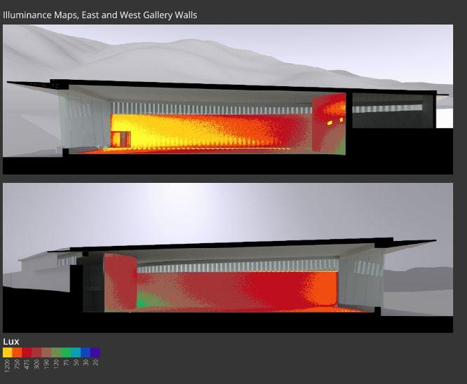 Detailed daylight analysis explored a series of skylight and clerestory schemes and informed the setting out, depth and angling of solar fins along the east and westfacing clerestories and to carefully assess visual comfort throughout the exhibition and event spaces.