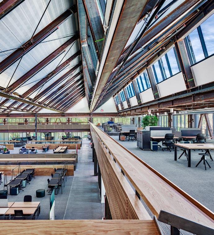 The office layout is organized as cascading zones of focus, ranging from quiet conference rooms and private phone booths, to library-like open offices, to active and lively game spaces, kitchenettes, and other amenities. The triple-height space is capped with a sawtooth roof with integrated clerestory windows. The main work area on the second floor is rimmed with glasswall meeting rooms on the perimeter, allowing for ample daylight to pass to the spaces beyond.