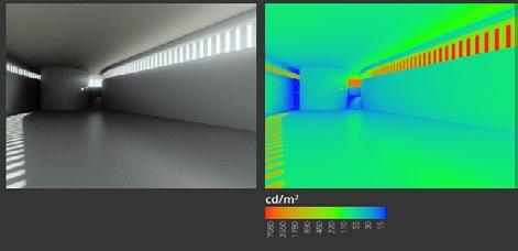 Pink shows areas of the scene where the luminance exceeds 2000 cd/m2; an occupant would experience this as harsh glare and blinds would need to be lowered.