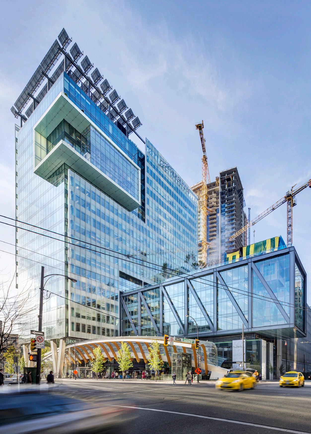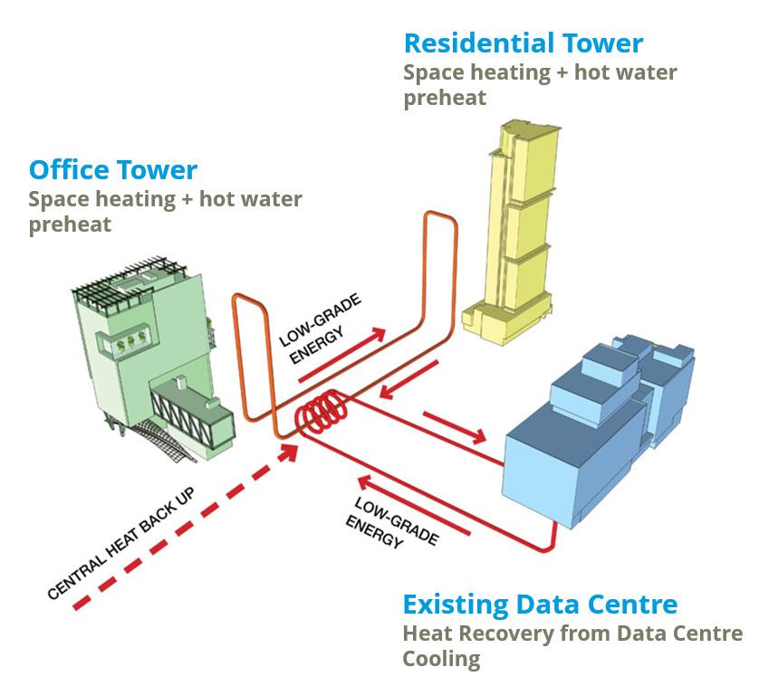 The development features a central plant with high efficiency heat pumps and waste heat recovery from the TELUS Data Centre, radiant heating and cooling, demand-controlled ventilation, and LED lighting.