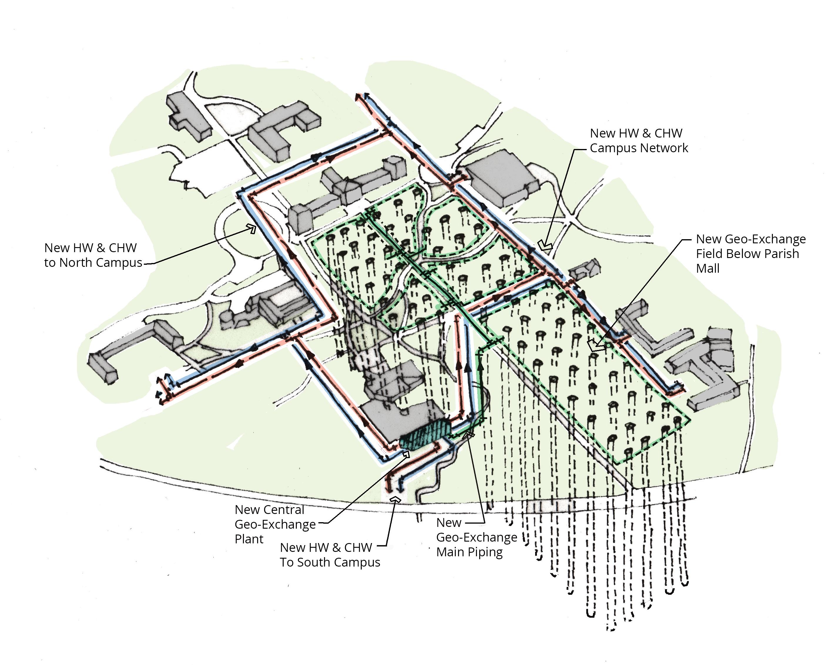 Key Features - Designed to provide low/zero carbon emissions heating and cooling for campus via a geo-exchange central plant.